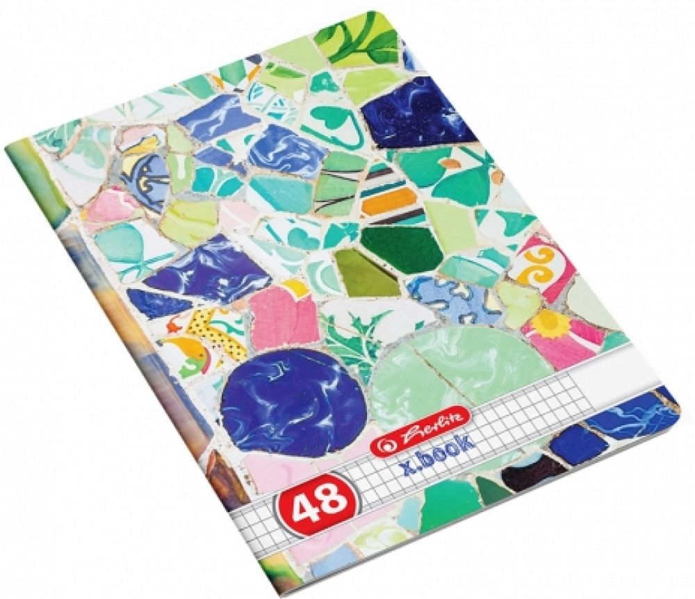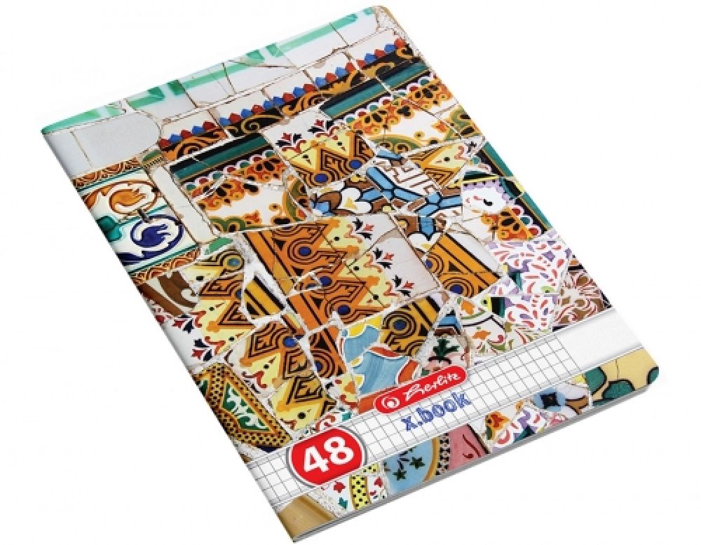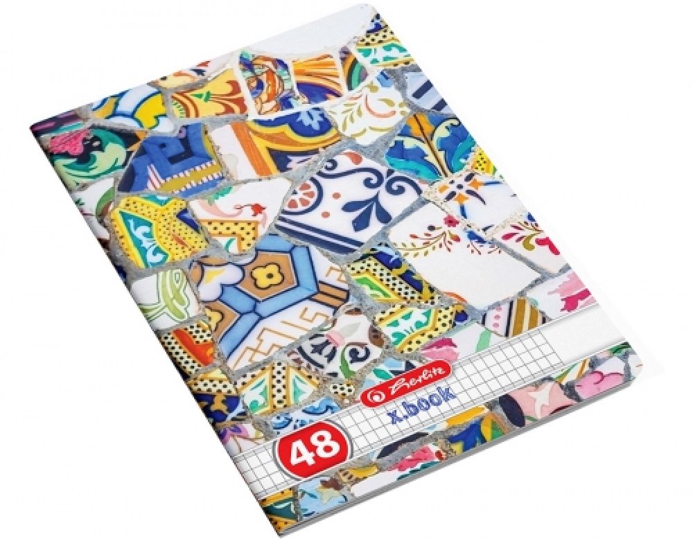 Caiet, format A4, coperti din carton dublu cretat, lucios, colturi rotunjite, hârtie 70 g/mp, 48 file, patratele, capsat, motiv Mozaic.