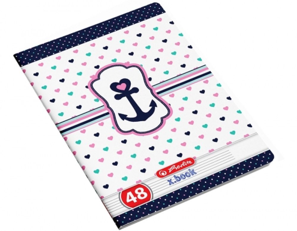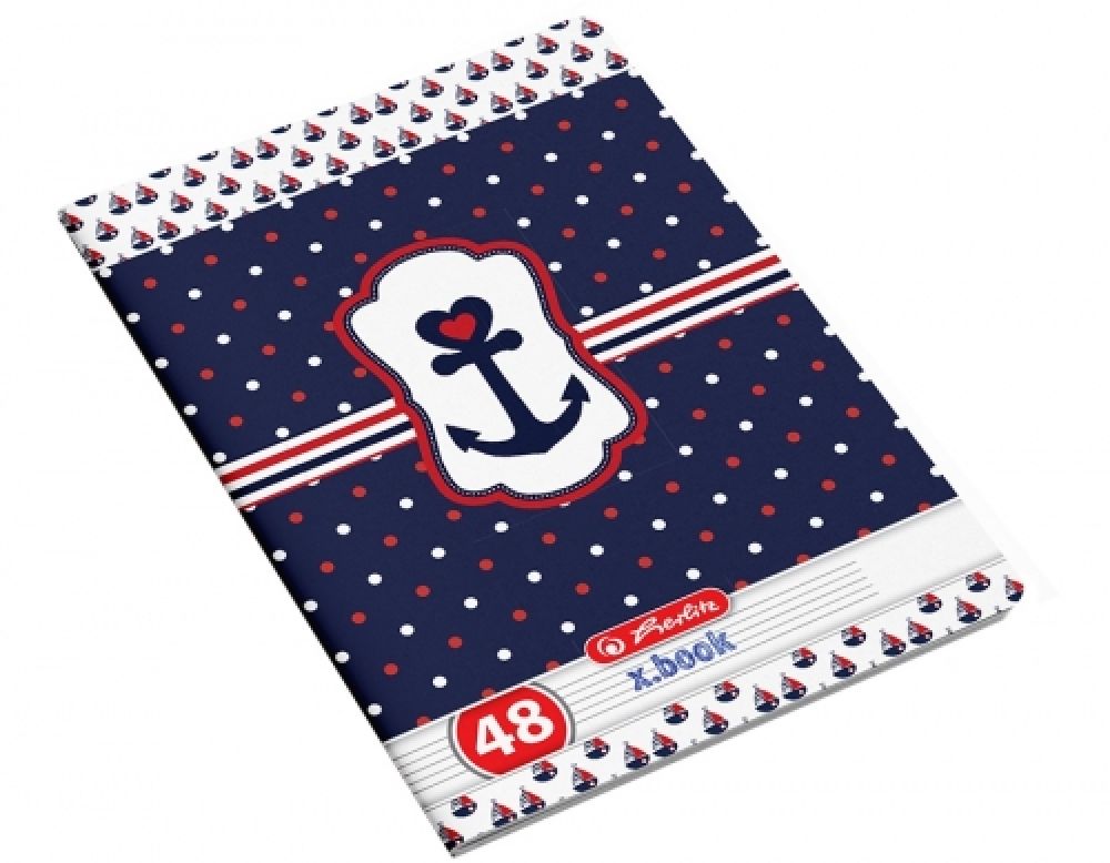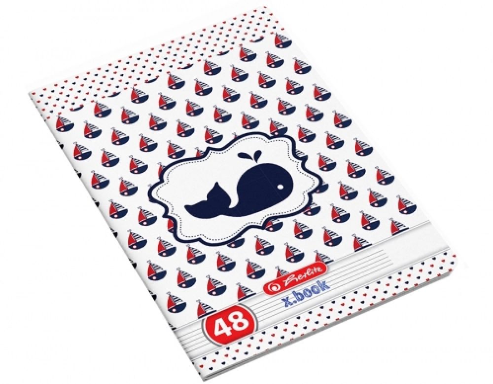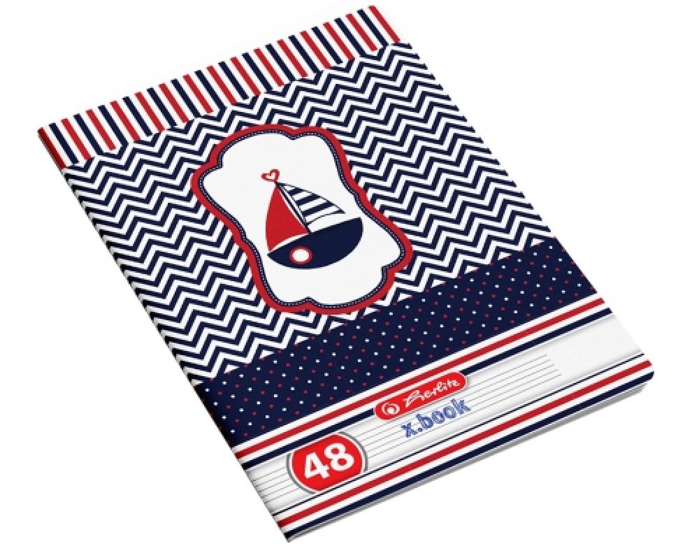 Caiet, format A5, coperti din carton dublu cretat, lucios, colturi rotunjite, hârtie 70 g/mp, 48 file, dictando, capsat, motiv Nautica.
