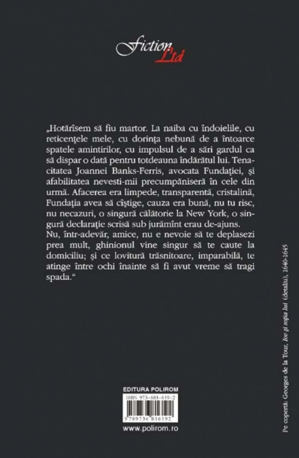 „Hotarisem sa fiu martor. La ... cu indoielile, cu reticentele mele, cu dorinta nebuna de a intoarce spatele amintirilor, cu impulsul de a sari gardul ca sa dispar o data pentru totdeauna indaratul lui. Tenacitatea Joannei Banks-Ferris, avocata Fundatiei, si afabilitatea nevesti-mii precumpanisera in cele din urma. Afacerea era limpede, transparenta, cristalina, Fundatia avea sa cistige, cauza era buna, nu tu risc, nu necazuri, o singura calatorie la New York, o singura declaratie scrisa sub juramint erau de-ajuns. Nu, intr-adevar, amice, nu e nevoie sa te deplasezi prea mult, ghinionul vine singur sa te caute la domiciliu; si ce lovitura trasnitoare, imparabila, te atinge intre ochi inainte sa fi avut vreme sa tragi spada.“ (fragment din roman)