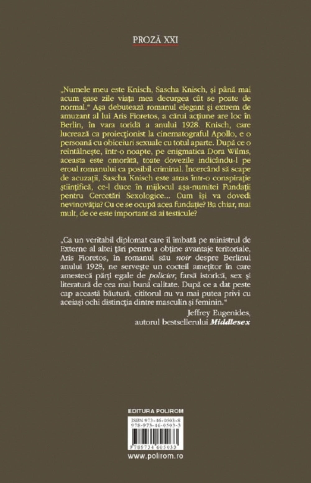Actiunea romanului se petrece la Berlin, in torida vara a anului 1928. Sascha Knisch, un barbat cu obiceiuri sexuale aparte, lucreaza ca operator la cinematograful „Apollo”. Intr-o seara o reintilneste pe enigmatica Dora Wilms, cu care are o aventura secreta. O saptamina mai tirziu, cind politia descopera trupul neinsufletit al Dorei, Knisch este acuzat de crima. Incercind sa-si dovedeasca nevinovatia, personajul da de urma unei conspiratii stiintifice si se trezeste implicat intr-o poveste in care nimic nu este ce pare a fi. Cum poate dovedi ceva ce, aparent, nu s-a intimplat niciodata? Ce se petrece de fapt la Fundatia pentru Cercetari Sexologice? Si de ce este important sa ai testicule? Romanul reuseste sa reconstruiasca atmosfera unei epoci de criza, cu o gratie si un nerv narativ ce amintesc de Vladimir Nabokov, combinind in mod ingenios si rafinat istoria si fictiunea si intretesind totodata in urzeala complicata a naratiunii un tratat subtil de politica identitara.