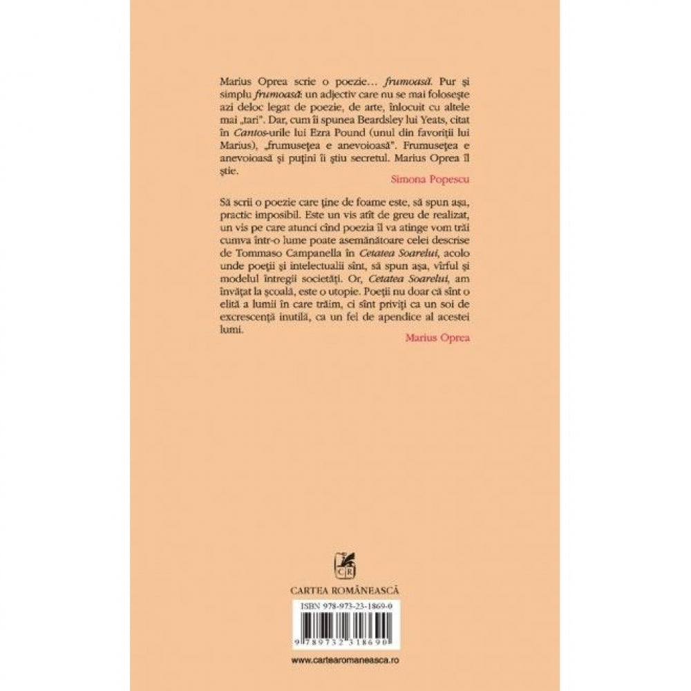 „Sa scrii o poezie care tine de foame este, sa spun asa, practic imposibil. Este un vis atit de greu de realizat, un vis pe care atunci cind poezia il va atinge vom trai cumva intr-o lume poate asemanatoare celei descrise de Tommaso Campanella in Cetatea Soarelui, acolo unde poetii si intelectualii sint, sa spun asa, virful si modelul intregii societati. Or, Cetatea Soarelui, am invatat la scoala, este o utopie. Poetii nu doar ca sint o elita a lumii in care traim, ci sint priviti ca un soi de excrescenta inutila, ca un fel de apendice al acestei lumi.” (Marius Oprea)