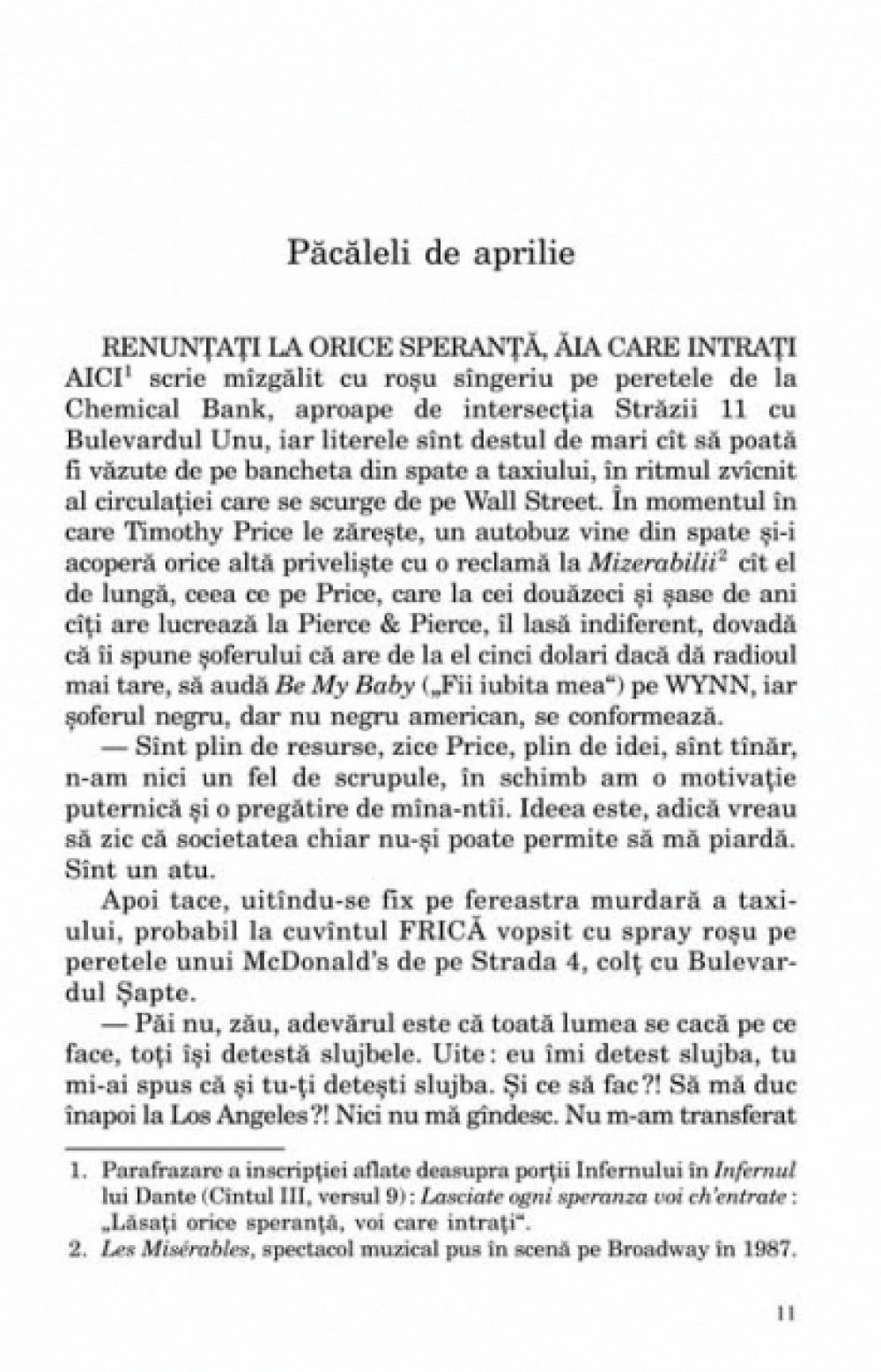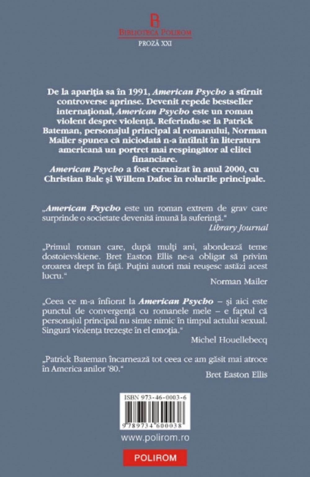 Una dintre cele mai controversate carti aparute in America ultimilor ani, roman-cult al anilor ’90, American Psycho a declansat controverse aprinse, autorul fiind chiar obligat sa-si anuleze primul turneu de promovare a cartii din cauza amenintarilor. Ellis a fost amenintat cu moartea, i s-a reprosat cruzimea la adresa femeilor, iar o organizatie feminista din Los Angeles l-a dat in judecata. Devenit repede bestseller, American Psycho este un roman violent despre violenta. Patrick Bateman, personajul principal al romanului este un tinar frumos, educat, inteligent. Ziua lucreaza pe Wall Street, sporind averea deja considerabila a familiei lui, iar noaptea se ocupa cu lucruri care ne inspaiminta pe noi, oamenii normali. Actiunea este plasata intr-o lume (Manhattan) si intr-o epoca (anii ’80) in care bogatii devin tot mai bogati, iar saracii si nebunii ajung pe strazi cu zecile de mii, facind ca orice imaginatie, chiar si cea mai oribila, sa devina posibila. Iata de ce Bateman, care este cu adevarat el insusi numai atunci cind tortureaza si ucide, se transforma in profetul unei orori apocaliptice. O oroare cu care nici o societate nu este pregatita sa lupte. Romanul lui Bret Easton Ellis studiaza abisurile de neinteles ale nebuniei si reuseste sa surprinda absurditatea violentei din vremurile noastre – de fapt, din oricare alte vremuri. Finalul ramine deschis. Romanul a fost ecranizat in anul 2000, cu Christian Bale si Willem Dafoe in rolurile principale.