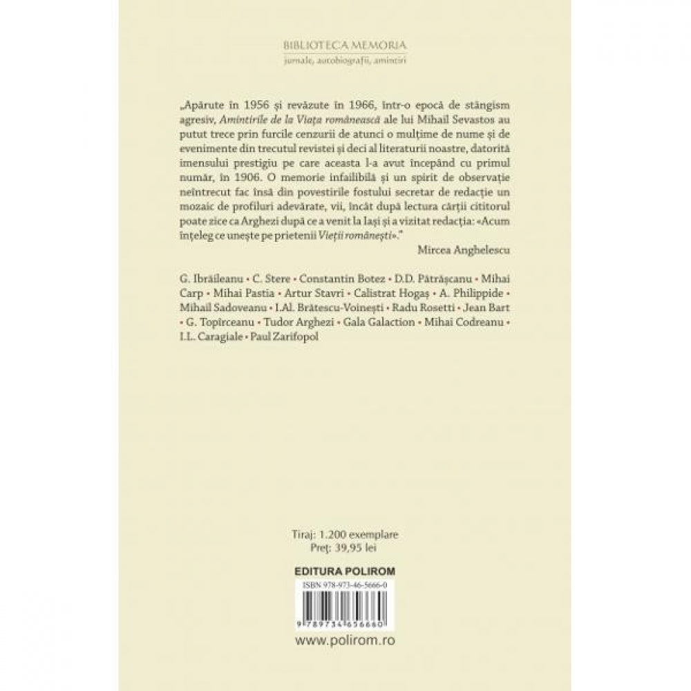 „Aparute in 1956 si revazute in 1966, intr-o epoca de stingism agresiv, Amintirile de la Viata romaneasca ale lui Mihail Sevastos au putut trece prin furcile cenzurii de atunci o multime de nume si de evenimente din trecutul revistei si deci al literaturii noastre, datorita imensului prestigiu pe care aceasta l-a avut incepind cu primul numar, in 1906. O memorie infailibila si un spirit de observatie neintrecut fac insa din povestirile fostului secretar de redactie un mozaic de profiluri adevarate, vii, incit dupa lectura cartii cititorul poate zice ca Arghezi dupa ce a venit la Iasi si a vizitat redactia: «Acum inteleg ce uneste pe prietenii Vietii romanesti».” (Mircea Anghelescu)