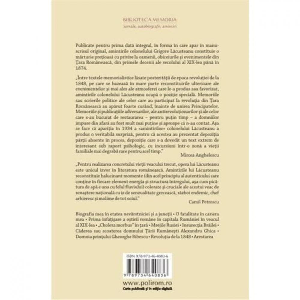 Publicate pentru prima data integral, in forma in care apar in manuscrisul original, amintirile colonelului Grigore Lacusteanu constituie o marturie pretioasa cu privire la oamenii, obiceiurile si evenimentele din Tara Romaneasca, din primele decenii ale secolului al XIX-lea pina in 1874.