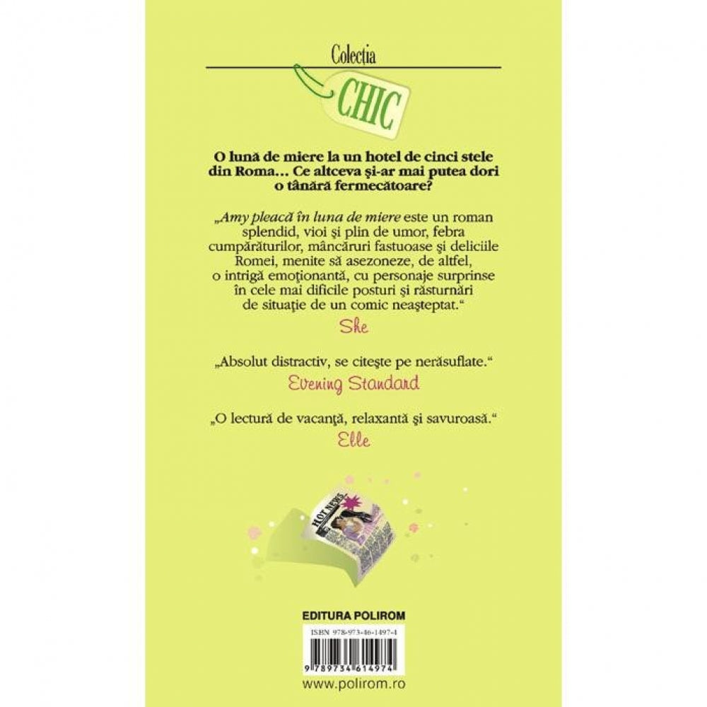 Amy pleaca in luna de miere este o carte cu un umor nestapinit, cu rasturnari de situatie, personaje haioase si o intriga care atrage din start interesul oricarui cititor: Amy, protagonista romanului, pleaca la Roma, in luna de miere. Insa, cum aflam inca din primele pagini, de la biroul de check-in al aeroportului care, pentru prima data in viata ei, ii ofera mult rivnitele conditii de lux rezervate cuplurilor proaspat casatorite, Amy pleaca in luna de miere fara nici un sot. Macar cu atit sa se aleaga, dupa ce n-a mai existat nici o nunta si nici nu se pune problema returnarii vreuneia dintre sumele cheltuite, evident, costisitoare. Insa, in ciuda supararii ei si a tristetii unei astfel de calatorii, Roma este un oras in care nimeni nu pare s-o lase in pace. Si nu e vorba de oaspeti obisnuiti ai hotelului, ci de celebritati disperate sa-si schimbe camera cu a ei. Si apoi, cum sa mai fie o biata fata in stare sa-si plinga soarta, daca in permanenta e tirita prin magazine, la premiere de film sau pe la picnicuri intime in doi? Dar, pina la urma, ce s-a intimplat cu mirele si chiar e posibil ca o vedeta sa se indragosteasca asa de prima fata care ii iese in cale?
