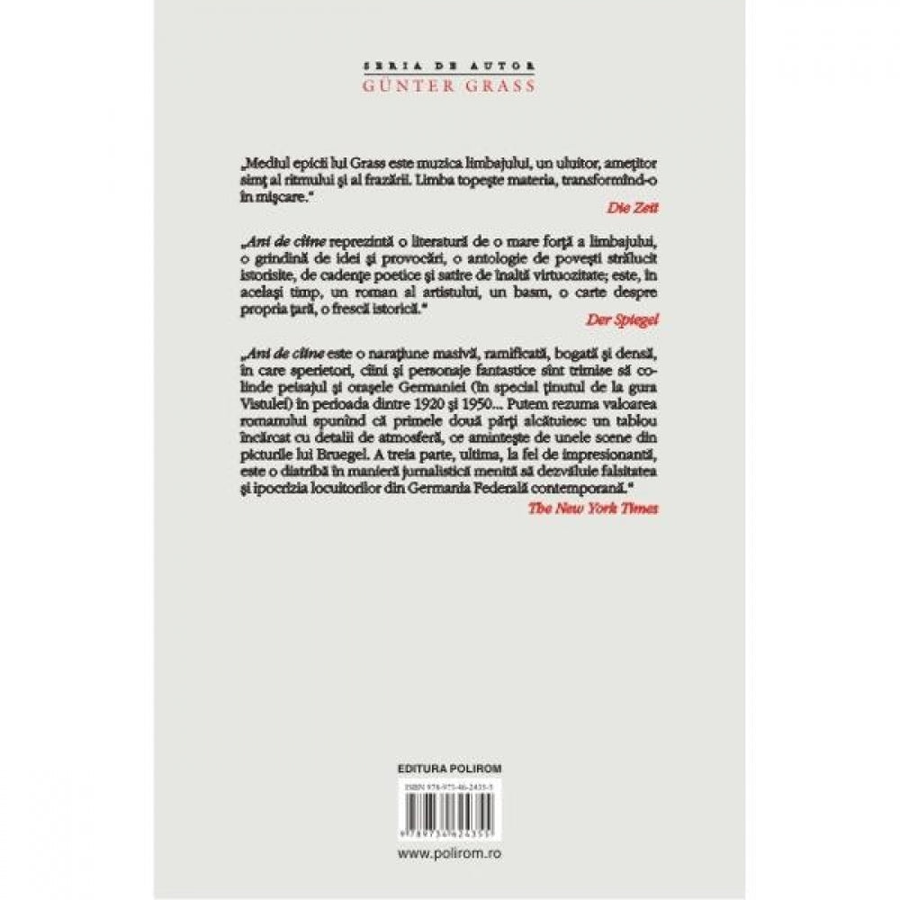 „Ani de ciine este o naratiune masiva, ramificata, bogata si densa, in care sperietori, ciini si personaje fantastice sint trimise sa colinde peisajul si orasele Germaniei (in special tinutul de la gura Vistulei) in perioada dintre 1920 si 1950... Putem rezuma valoarea romanului spunind ca primele doua parti alcatuiesc un tablou incarcat cu detalii de atmosfera, ce aminteste de unele scene din picturile lui Bruegel. A treia parte, ultima, la fel de impresionanta, este o diatriba in maniera jurnalistica menita sa dezvaluie falsitatea si ipocrizia locuitorilor din Germania Federala contemporana.” (The New York Times)