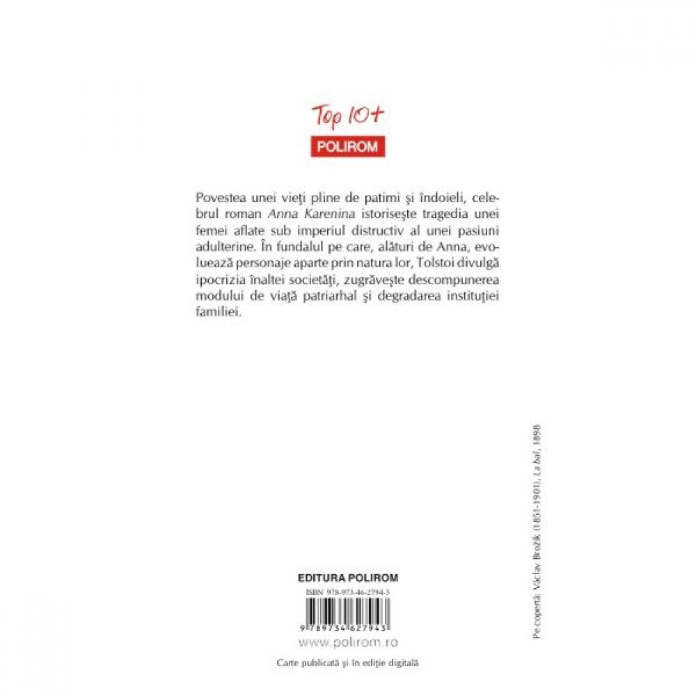 Povestea unei vieti pline de patimi si indoieli, celebrul roman Anna Karenina istoriseste tragedia unei femei aflate sub imperiul distructiv al unei pasiuni adulterine. In fundalul pe care, alaturi de Anna, evolueaza personaje aparte prin natura lor, Tolstoi divulga ipocrizia inaltei societati, zugraveste descompunerea modului de viata patriarhal si degradarea institutiei familiei.