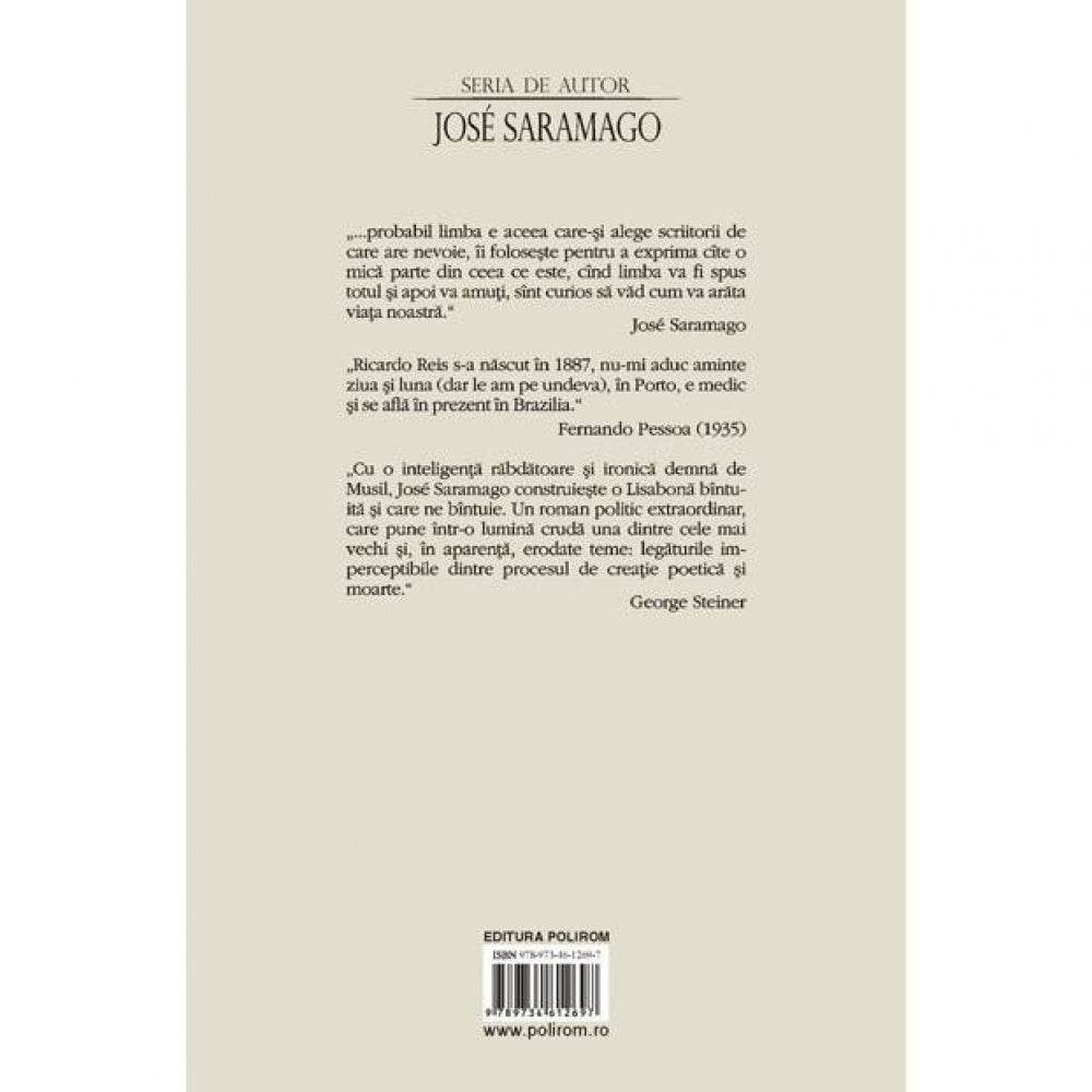 „Cu o inteligenta rabdatoare si ironica demna de Musil, Jose Saramago construieste o Lisabona bintuita si care ne bintuie. Un roman politic extraordinar, care pune intr-o lumina cruda una dintre cele mai vechi si, in aparenta, erodate teme: legaturile imperceptibile dintre procesul de creatie poetica si moarte.”(George Steiner)