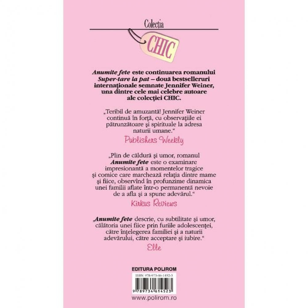 Anumite fete (Certain Girls, 2008)este continuarea romanului Super‑tare la pat, avind‑o ca eroina pe Cannie Shapiro, jurnalista de succes. La treisprezece ani de la intimplarile din Super‑tare la pat, protago­nista este acum mama, preocuparile sale sint fiica adolescenta si rebela, pe nume Joy, cariera scriitori­ceasca, relatia cu sotul ei, medicul Peter Krushelevansky, mincarea organica si, mai nou, cursurile de yoga. Viata ei pare sa se fi inscris intr‑un circuit minunat de previzibil, cu toata linistea la care rivnise si, de asemenea, tandretea si iubirea unei familii. Dar, din clipa in care Joy devine interesata de secretele de mult ingropate ale familiei, trecutul revine cu putere in viata lor de familie, supunind‑o pe Cannie la noi incercari si pe fiica ei la efortul de a intelege viata cu mai multa maturitate si umor decit pina atunci. Peste toate, Jennifer Weiner isi pune amprenta ei inconfunda­bila: frumusetea te ajuta sa scapi basma curata din orice situatie, natura umana e dificila si capricioasa, se cere in permanenta studiata si criticata, insa cu toate acestea sursele de umor sint nelipsite, iar bunul‑simt si obser­­vatiile patrunzatoare transforma romanul intr‑o lectura incintatoare.