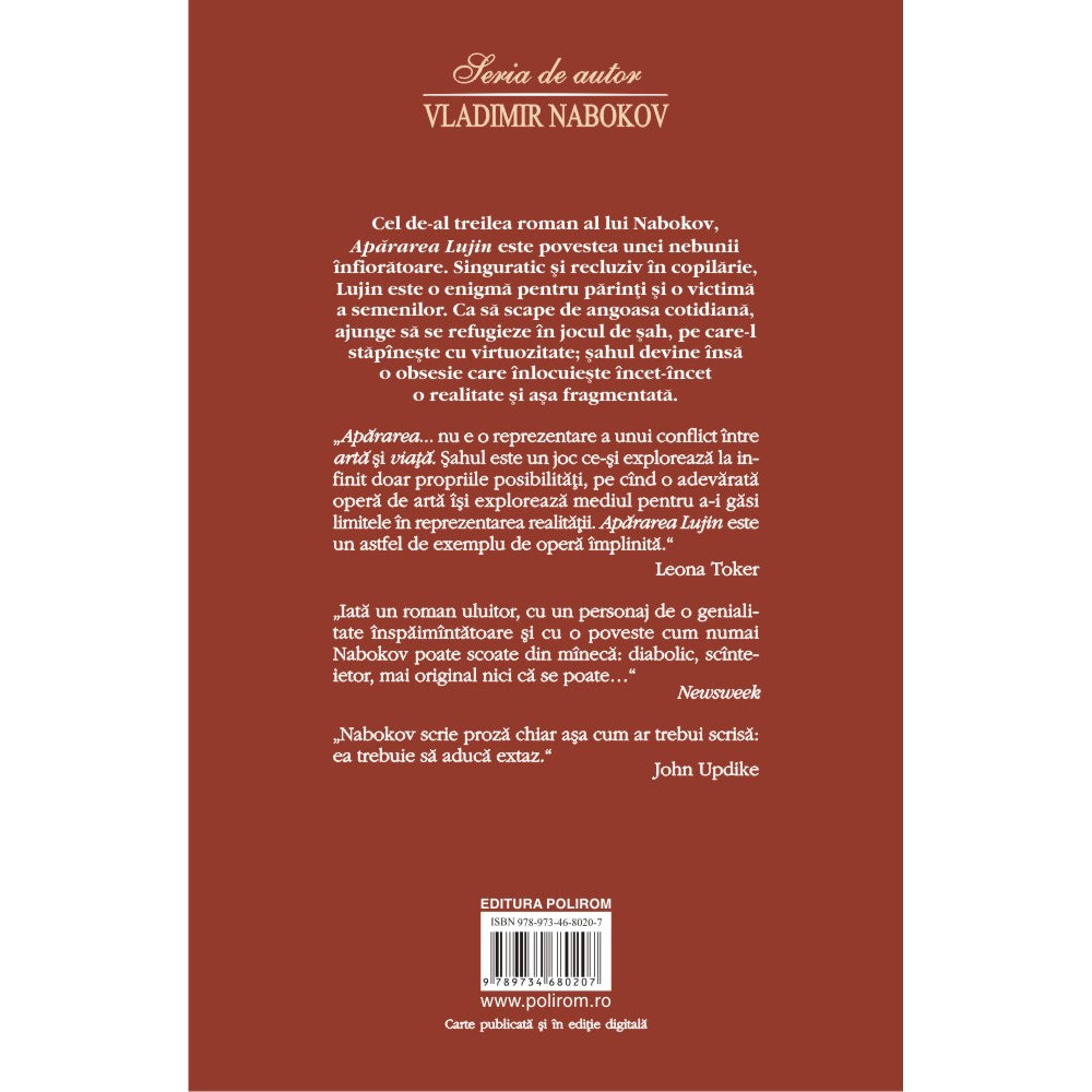 Cel de-al treilea roman al lui Nabokov, Apararea Lujin este povestea unei nebunii infioratoare. Singuratic si recluziv in copilarie, Lujin este o enigma pentru parinti si o victima a semenilor. Ca sa scape de angoasa cotidiana, ajunge sa se refugieze in jocul de sah, pe care-l stapaneste cu virtuozitate; sahul devine insa o obsesie care inlocuieste incet-incet o realitate si asa fragmentata.