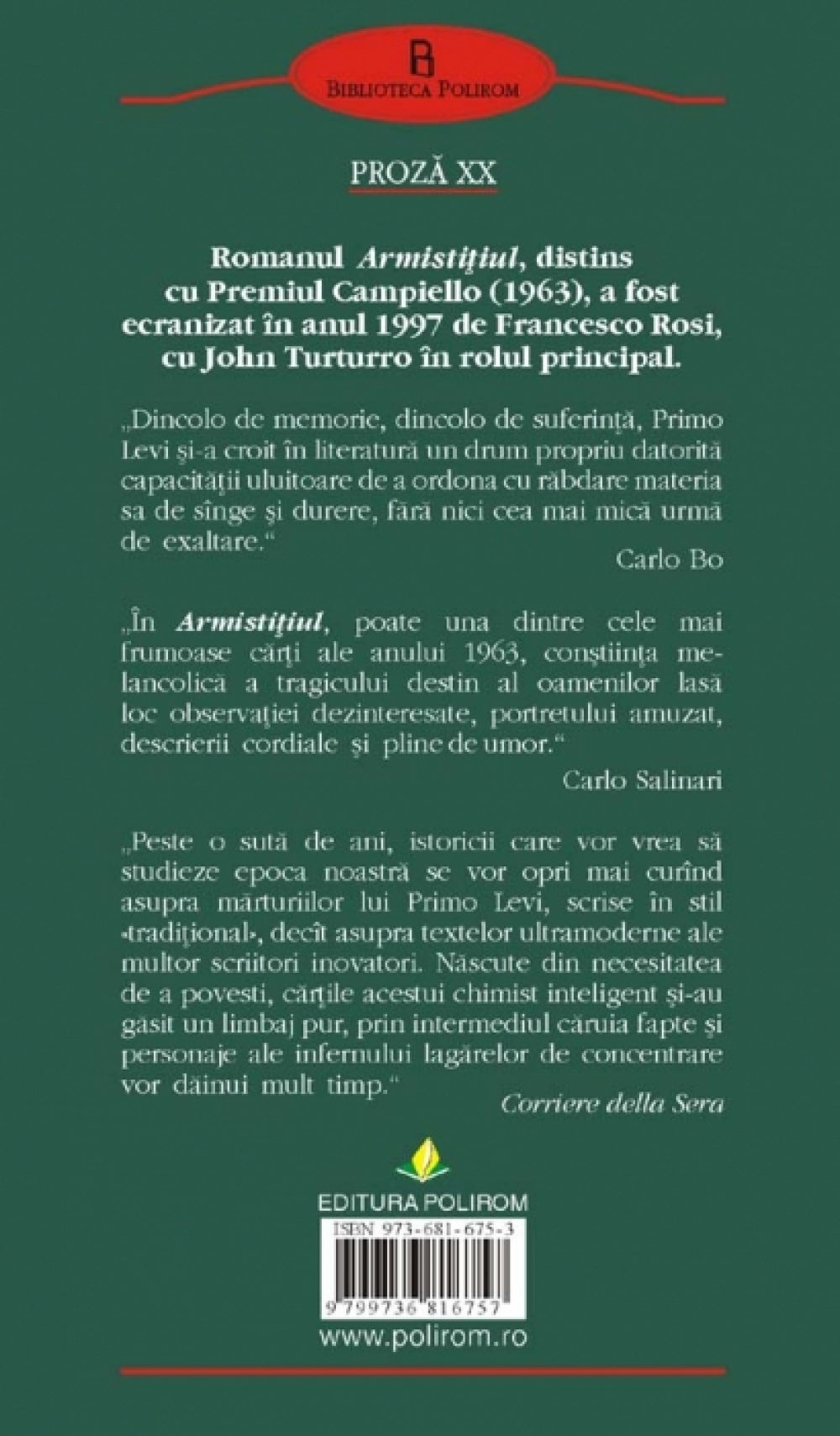 „Armistitiul” evoca intimplari din cele noua luni in care Primo Levi, impreuna cu un grup foarte numeros, a traversat o buna parte din Europa pe drumul de repatriere de la Auschwitz, trecind prin Polonia, Ucraina, Rusia, Romania, Ungaria si Austria. Romanul, distins cu prestigiosul Premiu Campiello, a beneficiat nu numai de un mare succes international de public, ci si de o excelenta ecranizare (1997), semnata de regizorul Francesco Rosi si avindu-l drept protagonist pe John Turturro.