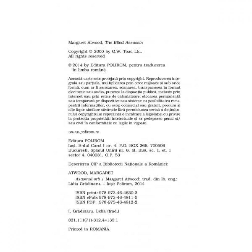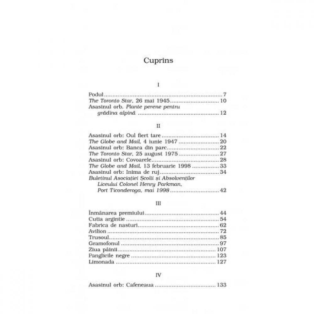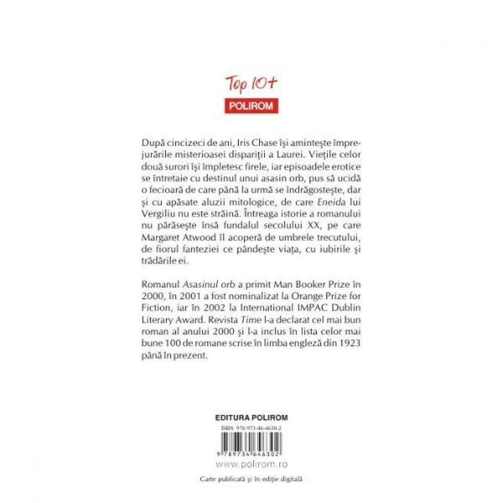 Dupa cincizeci de ani, Iris Chase isi aminteste imprejurarile misterioasei disparitii a Laurei. Vietile celor doua surori isi impletesc firele, iar episoadele erotice se intretaie cu destinul unui asasin orb, pus sa ucida o fecioara de care pina la urma se indragosteste, dar si cu apasate aluzii mitologice, de care Eneida lui Vergiliu nu este straina. Intreaga istorie a romanului nu paraseste insa fundalul secolului XX, pe care Margaret Atwood il acopera de umbrele trecutului, de fiorul fanteziei ce pindeste viata, cu iubirile si tradarile ei.