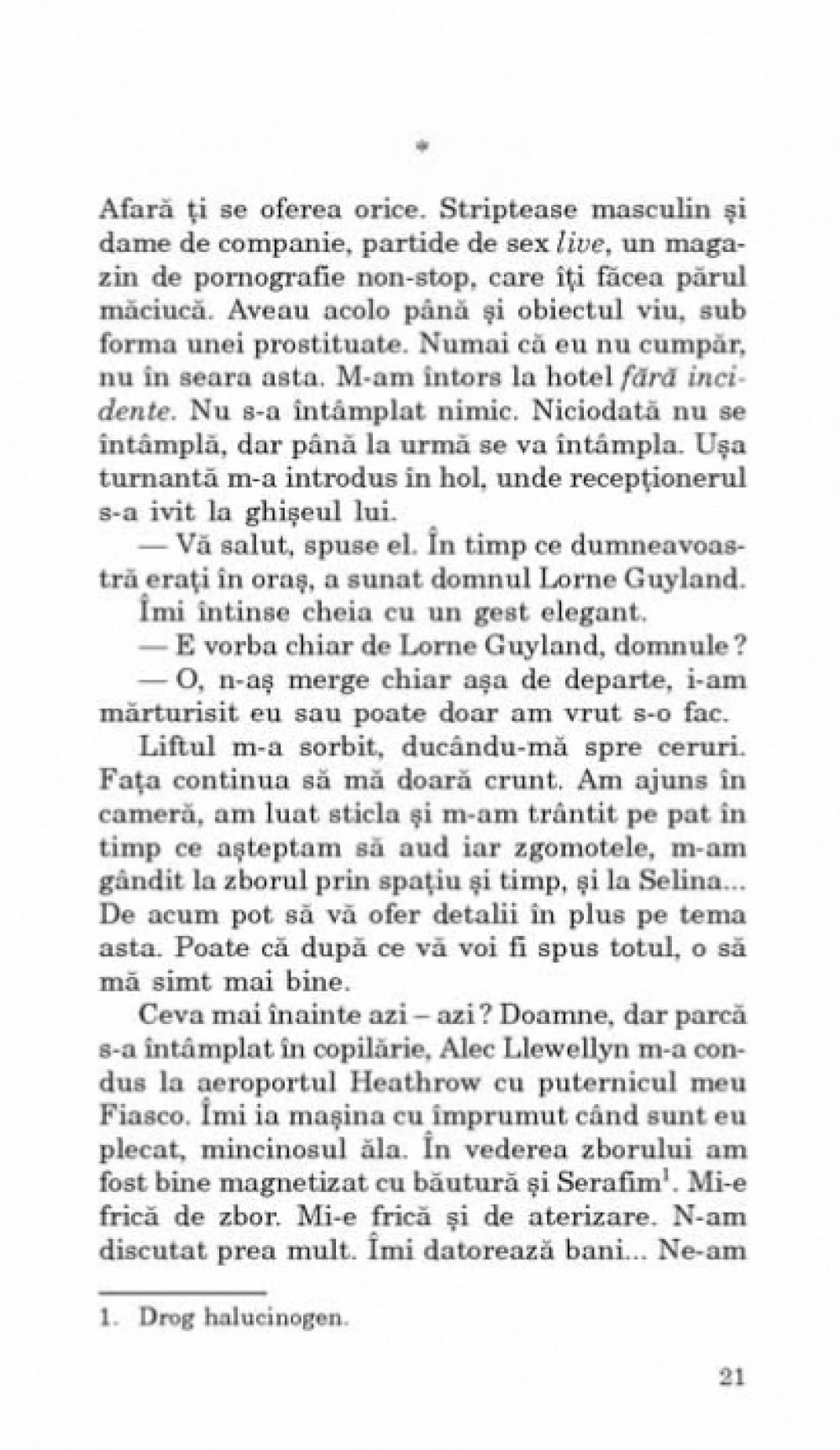 Romanul este povestea lui John Self, un consumator fara limite. Copil al secolului XX, eroul cartii calatoreste fara incetare intre New York si Londra, incheie afaceri, cheltuieste sume exorbitante si intra in lumea ametitoare a filmului, visind la marea lovitura. In tot acest timp profita din plin de tot ce i se ofera pentru a-si satisface apetitul insatiabil: alcool, tutun, droguri, un munte de junk-food si mai ales pornografie, in toate formele sale. De o salbaticie a imaginatiei fara zagaz, cartea este o parabola despre viata traita in deriva, fara nici un dram de cumpatare, iar tema ei centrala sint banii, nenorocirile pe care le produc, dezastrele in care ne adincesc.