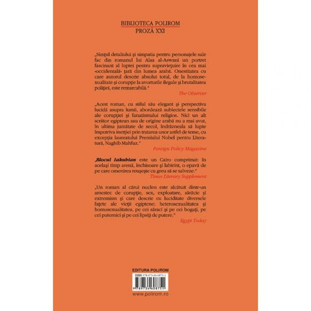Cel de‑al doilea roman al lui Alaa al‑Aswani, Blocul Iakubian (aparut in 2002), a provocat dezbateri aprinse, raminind de atunci cea mai bine vinduta carte in limba araba, tradusa in numeroase alte tari si transformata intr‑un film egiptean de succes in 2006. Romanul prezinta o imagine plina de ironie a Egiptului modern prin intermediul locatarilor unui bloc din centrul Cairoului. De la fiul pios al portarului, aristocratul scapatat si intelectualul homosexual la vaga­bonzii refugiati pe terasa si afaceristii fara scrupule care detin pravaliile de la parter, fiecare personaj reprezinta o fateta a Egiptului modern – in care coruptia politica, averile cistigate ilicit si ipocrizia religioasa se conjuga cu aroganta si agresivitatea puterni­cilor zilei, iar idealismul tineresc se poate transforma cu repeziciune in extremism. Tuturor aces­tora li se opune totusi o viziune mai veche si mai pasnica a societatii, care inca mai poate avea cistig de cauza.