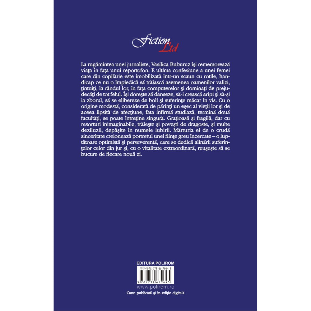 La rugamintea unei jurnaliste, Vasilica Buburuz isi rememoreaza viata in fata unui reportofon. E ultima confesiune a unei femei care din copilarie este imobilizata intr-un scaun cu rotile, handicap ce nu o impiedica sa traiasca asemenea oamenilor valizi, tintuiti, la randul lor, in fata computerelor si dominati de prejudecati de tot felul. Isi doreste sa danseze, sa-i creasca aripi si sa-si ia zborul, sa se elibereze de boli si suferinte macar in vis. Cu o origine modesta, considerata de parinti un esec al vietii lor si de aceea lipsita de afectiune, fata infirma studiaza, termina doua facultati, se poate intretine singura. Gratioasa si fragila, dar cu resorturi inimaginabile, traieste si povesti de dragoste, si multe deziluzii, depasite in numele iubirii. Marturia ei de o cruda sinceritate creioneaza portretul unei fiinte greu incercate – o luptatoare optimista si perseverenta, care se dedica alinarii suferintelor celor din jur si, cu o vitalitate extraordinara, reuseste sa se bucure de fiecare noua zi.