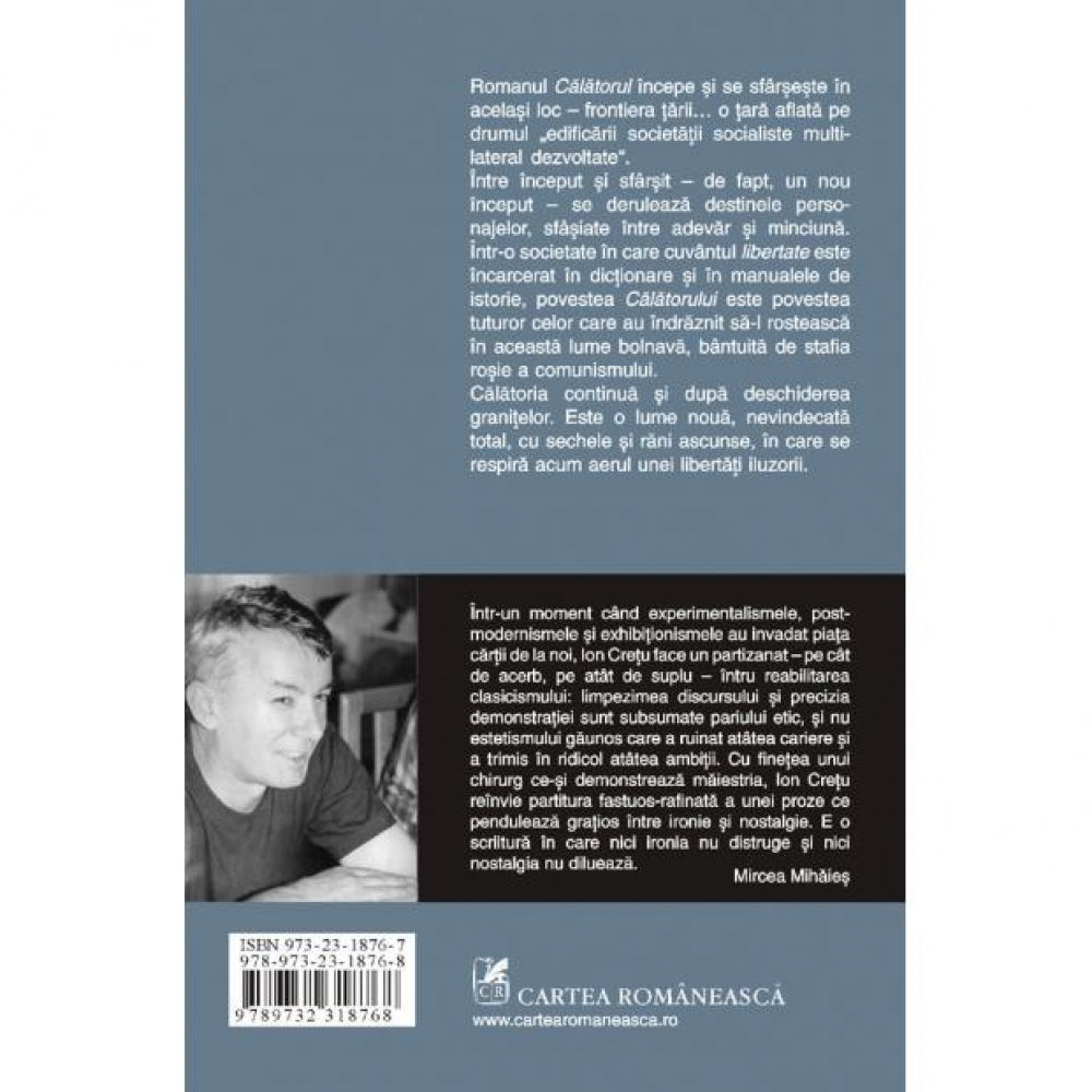 Romanul Calatorul incepe si se sfirseste in acelasi loc – frontiera tarii... o tara aflata pe drumul „edificarii societatii socialiste multilateral dezvoltate“. Intre inceput si sfirsit – de fapt, un nou inceput – se deruleaza destinele personajelor, sfisiate intre adevar si minciuna. Intr-o societate in care cuvintul libertate este incarcerat in dictionare si in manualele de istorie, povestea Calatorului este povestea tuturor celor care au indraznit sa-l rosteasca in aceasta lume bolnava, bintuita de stafia rosie a comunismului. Calatoria continua si dupa deschiderea granitelor. Este o lume noua, nevindecata total, cu sechele si rani ascunse, in care se respira acum aerul unei libertati iluzorii.