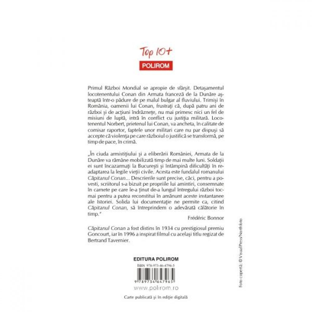 Capitanul Conan a fost distins in 1934 cu prestigiosul premiu Goncourt, iar in 1996 a inspirat filmul cu acelasi titlu regizat de Bertrand Tavernier.