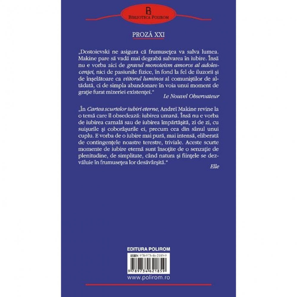 „In Cartea scurtelor iubiri eterne, Andrei Makine revine la o tema care il obsedeaza: iubirea umana. Insa nu e vorba de iubirea carnala sau de iubirea impartasita, zi de zi, cu suisurile si coborisurile sale, precum cea din sinul unui cuplu. E vorba de o iubire mai pura, mai intensa, eliberata de contingentele noastre terestre, triviale. Aceste scurte momente de iubire eterna sint insotite de o senzatie de plenitudine, de simplitate, cind natura si fiintele se dezvaluie in frumusetea lor desavirsita.” (Elle)