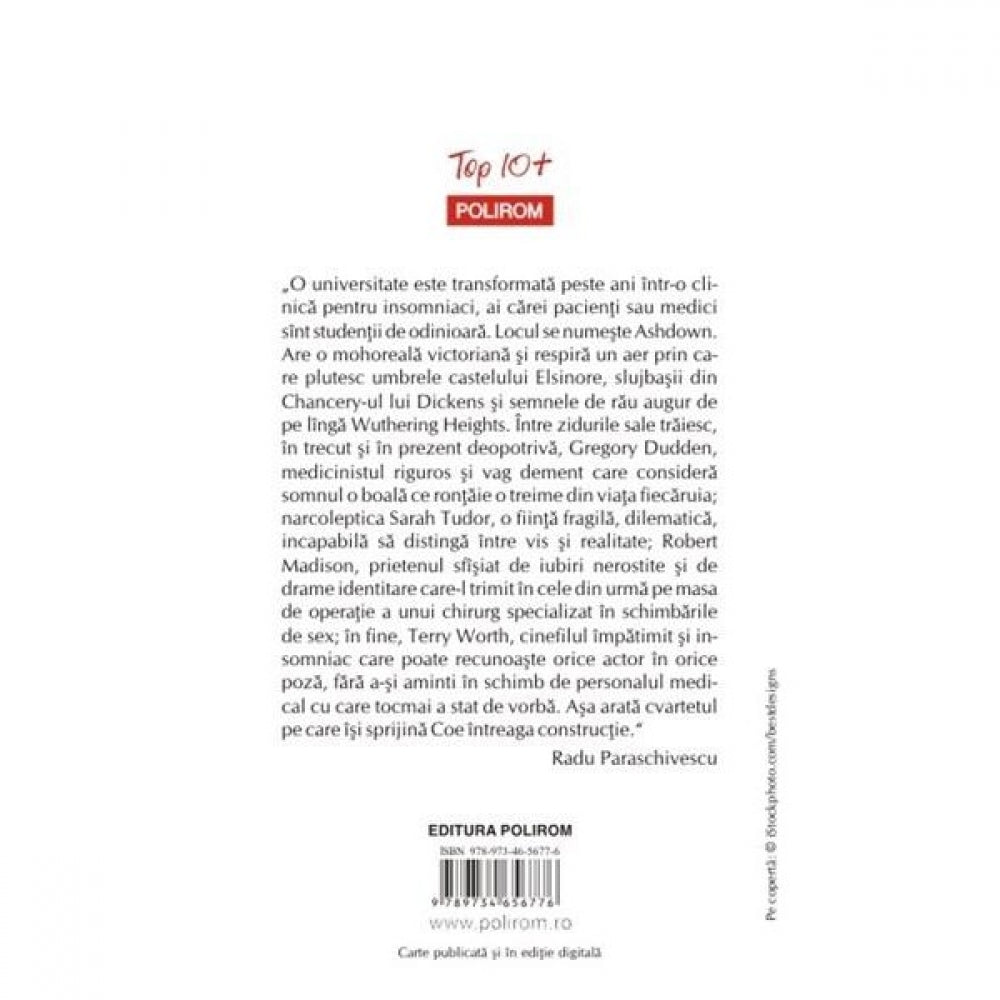 „O universitate este transformata peste ani intr-o clinica pentru insomniaci, ai carei pacienti sau medici sint studentii de odinioara. Locul se numeste Ashdown. Are o mohoreala victoriana si respira un aer prin care plutesc umbrele castelului Elsinore, slujbasii din Chancery-ul lui Dickens si semnele de rau augur de pe linga Wuthering Heights. Intre zidurile sale traiesc, in trecut si in prezent deopotriva, Gregory Dudden, medicinistul riguros si vag dement care considera somnul o boala ce rontaie o treime din viata fiecaruia; narcoleptica Sarah Tudor, o fiinta fragila, dilematica, incapabila sa distinga intre vis si realitate; Robert Madison, prietenul sfisiat de iubiri nerostite si de drame identitare care-l trimit in cele din urma pe masa de operatie a unui chirurg specializat in schimbarile de sex; in fine, Terry Worth, cinefilul impatimit si insomniac care poate recunoaste orice actor in orice poza, fara a-si aminti in schimb de personalul medical cu care tocmai a stat de vorba. Asa arata cvartetul pe care isi sprijina Coe intreaga constructie.” (Radu Paraschivescu)