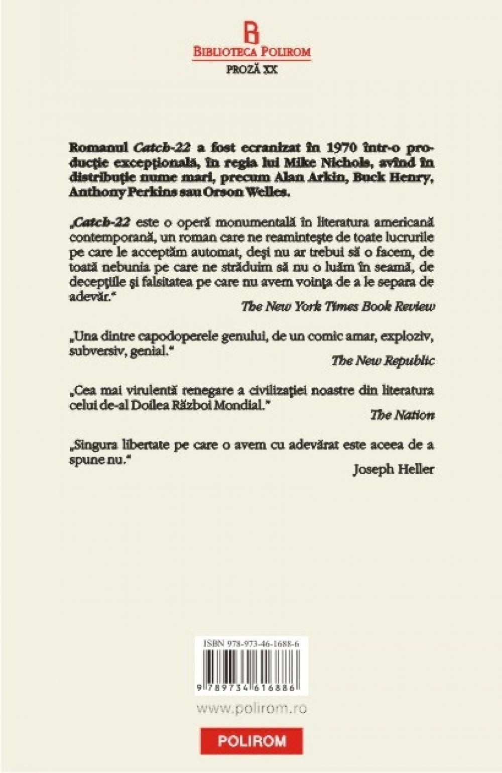 „Catch-22 este o opera monumentala in literatura americana contemporana, un roman care ne reaminteste de toate lucrurile pe care le acceptam automat, desi nu ar trebui sa o facem, de toata nebunia pe care ne straduim sa nu o luam in seama, de deceptiile si falsitatea pe care nu avem vointa de a le separa de adevar.” (The New York Times Book Review)