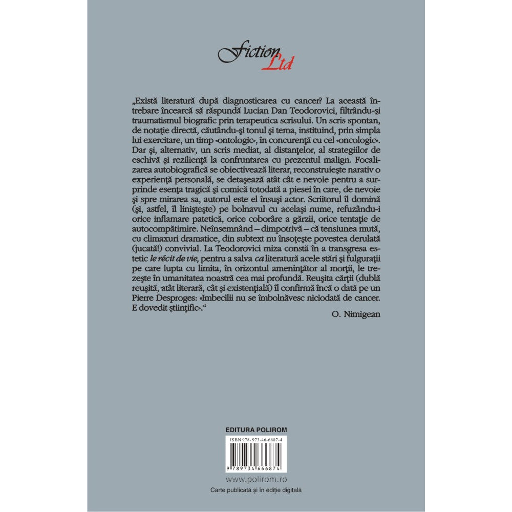 O poveste reala despre incercarea de a supravietui prin fictiune, o naratiune alerta si acaparanta despre lumi care se construiesc acolo unde limitele organismului nu te lasa sa ajungi. Romanul autobiografic al lui Teodorovici este locul in care, rind pe rind, superstitiile se transforma in miracole, iar miracolele pot fi oricind luate drept coincidente, lasindu-i cititorului libertatea de a umple cu sens intimplarile.