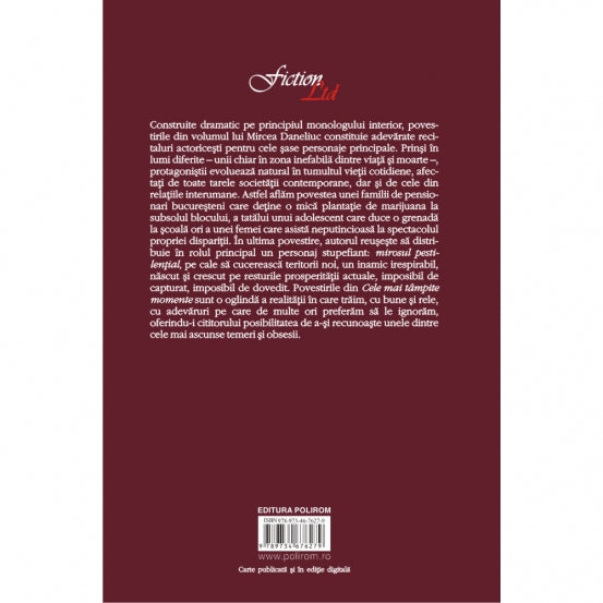 In ultima povestire, autorul reuseste sa distribuie in rolul principal un personaj stupefiant: mirosul pestilential, pe cale sa cucereasca teritorii noi, un inamic irespirabil, nascut si crescut pe resturile prosperitatii actuale, imposibil de capturat, imposibil de dovedit. Povestirile din Cele mai timpite momente sint o oglinda a realitatii in care traim, cu bune si rele, cu adevaruri pe care de multe ori preferam sa le ignoram, oferindu-i cititorului posibilitatea de a-si recunoaste unele dintre cele mai ascunse temeri si obsesii.