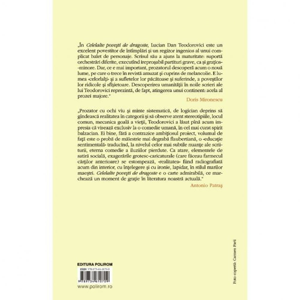 „In Celelalte povesti de dragoste, Lucian Dan Teodorovici este un excelent povestitor de intimplari si un regizor ingenios al unui complicat balet de personaje. Scrisul sau a ajuns la maturitate: suporta orchestrari diferite, executind ireprosabil partituri grave, ca si gratios-minore. Dar, ce e mai important, prozatorul descopera acum o noua lume, pe care o trece in revista amuzat si cuprins de melancolie. E lumea «celorlalti» si a sufletelor lor pacatoase si suferinde, a povestilor lor ridicole si sfisietoare. Descoperirea umanitatii in noile scrieri ale lui Teodorovici reprezinta, de fapt, atingerea unui continent: acela al prozei majore.”(Doris Mironescu)