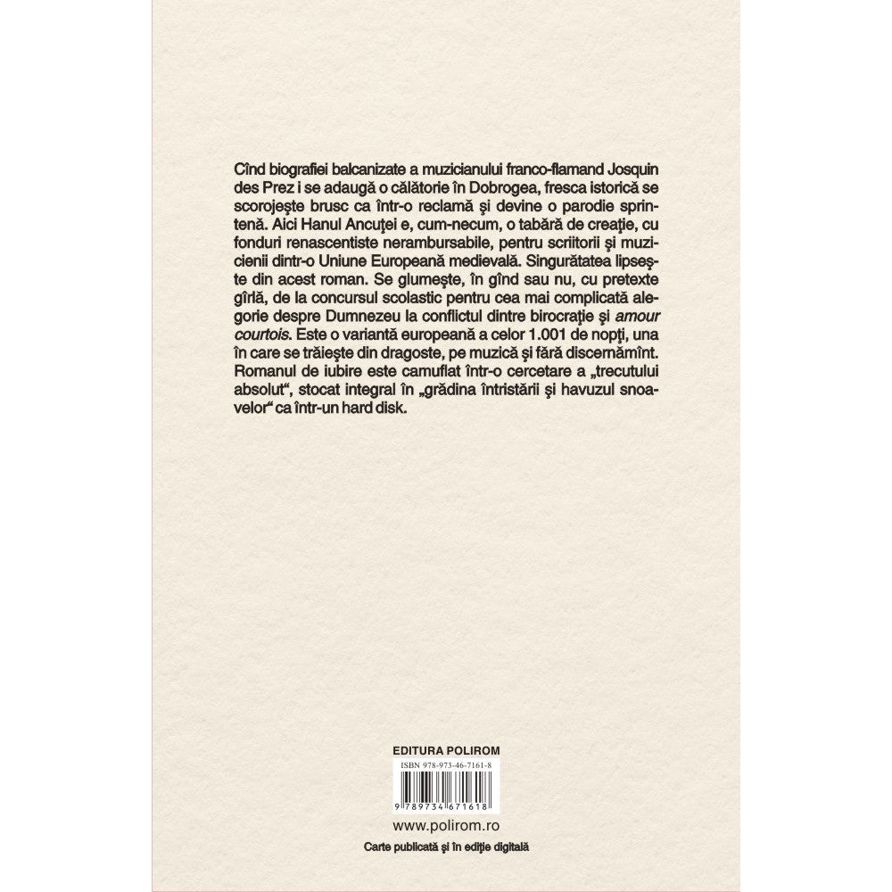 Cind biografiei balcanizate a muzicianului franco-flamand Josquin des Prez i se adauga o calatorie in Dobrogea, fresca istorica se scorojeste brusc ca intr-o reclama si devine o parodie sprintena. Aici Hanul Ancutei e, cum-necum, o tabara de creatie, cu fonduri renascentiste nerambursabile, pentru scriitorii si muzicienii dintr-o Uniune Europeana medievala. Singuratatea lipseste din acest roman. Se glumeste, in gind sau nu, cu pretexte girla, de la concursul scolastic pentru cea mai complicata alegorie despre Dumnezeu la conflictul dintre birocratie si amour courtois. Este o varianta europeana a celor 1.001 de nopti, una in care se traieste din dragoste, pe muzica si fara discernamint. Romanul de iubire este camuflat intr-o cercetare a „trecutului absolut”, stocat integral in „gradina intristarii si havuzul snoavelor” ca intr-un hard disk.