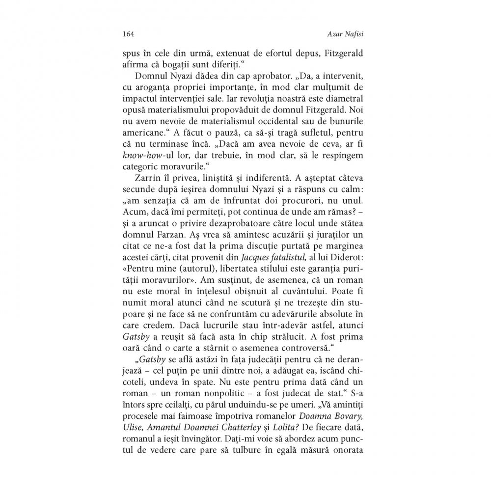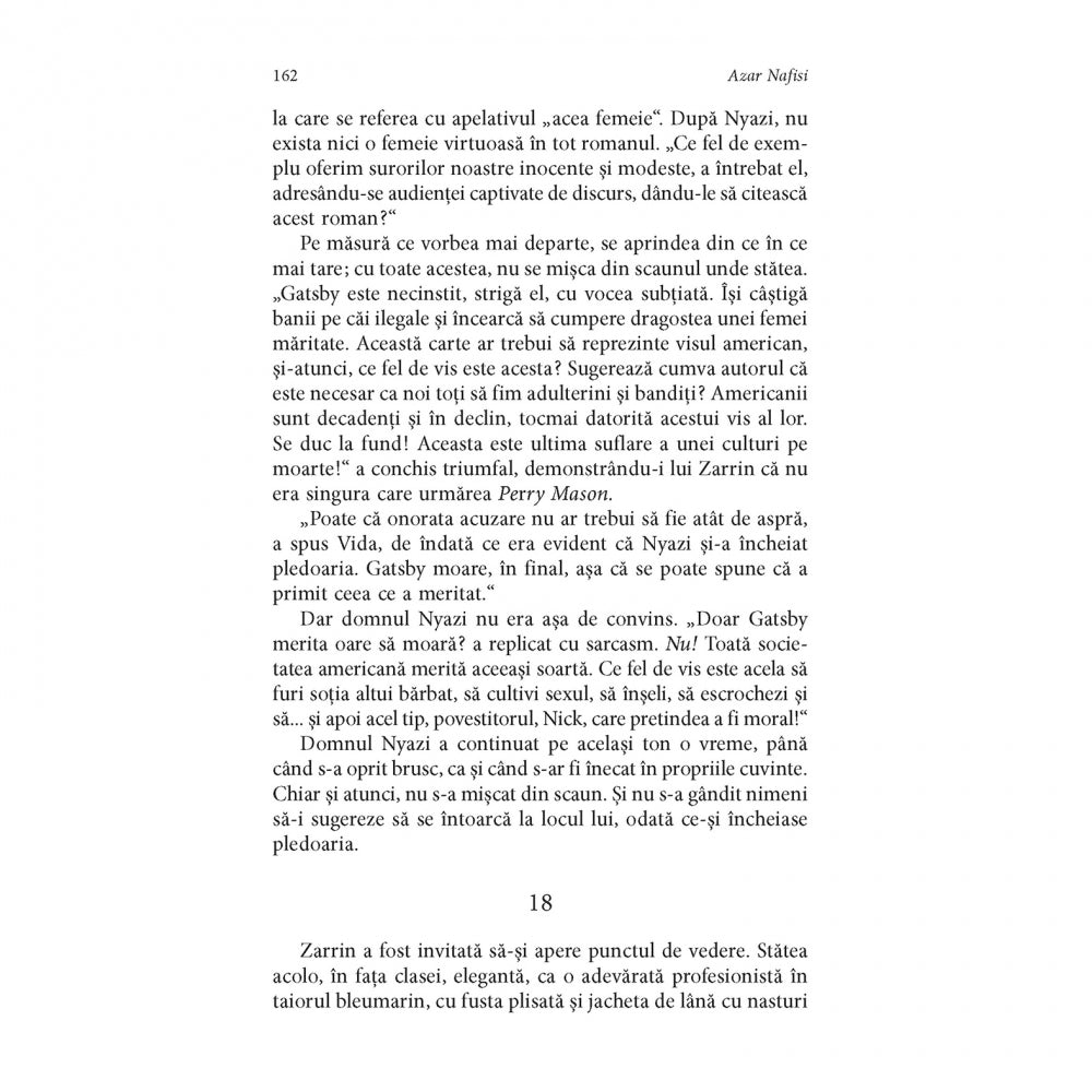 Si acolo unde, afara, moralitatea islamica aduce asupra Teheranului val dupa val de spaima si teroare, iar fundamentalistii inchid universitati si cenzureaza orice manifestare a expresiei artistice, inauntru, in sufrageria lui Azar, femeile vorbesc despre carti, despre visurile si dezamagirile lor. Dezvaluind o parte nevazuta a vietii femeilor din Iranul revolutionar,