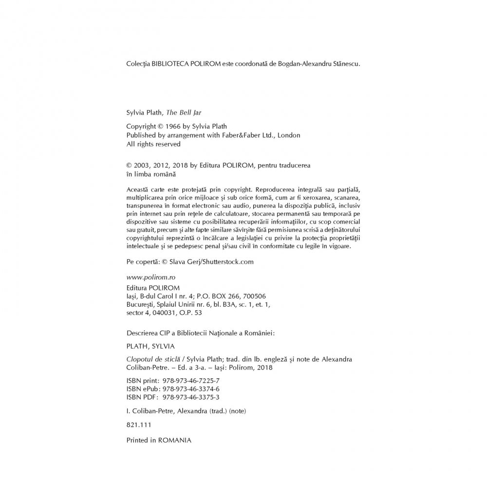 Cind, in 1953, Esther Greenwood cistiga „un concurs al unei reviste de moda, scriind eseuri si nuvele si poezii si reclame de moda”, e fericita: crede ca in sfirsit visul ei de a deveni scriitoare se va implini. Dar, intre cocktailuri si gramezile de manuscrise, Esther simte ca viata incepe sa-i scape din miini. Pe masura ce incearca sa razbata prin sirul relatiilor dificile si al pretentiilor unei societati ce refuza sa ia in serios aspiratiile femeii, ea se trezeste prinsa in virtejul depresiei si al tentatiei sinuciderii. Clopotul de sticla este un roman al ratacirii si regasirii, al instrainarii si redescoperirii de sine, al agoniei si al aparentei vindecari. Uimind prin ritm si umor, prin dezinvoltura si ironie, cartea ramine, inainte de orice, o ego-grafie a unuia dintre cele mai zbuciumate suflete feminine ale secolului XX.