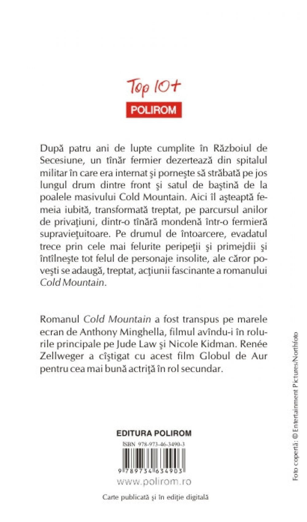 Dupa patru ani de lupte cumplite in Razboiul de Secesiune, un tinar fermier dezerteaza din spitalul militar in care era internat si porneste sa strabata pe jos lungul drum dintre front si satul de bastina de la poalele masivului Cold Mountain. Aici il asteapta femeia iubita, transformata treptat, pe parcursul anilor de privatiuni, dintr-o tinara mondena intr-o fermiera supravietuitoare. Pe drumul de intoarcere, evadatul trece prin cele mai felurite peripetii si primejdii si intilneste tot felul de personaje insolite, ale caror povesti se adauga, treptat, actiunii fascinante a romanului Cold Mountain.