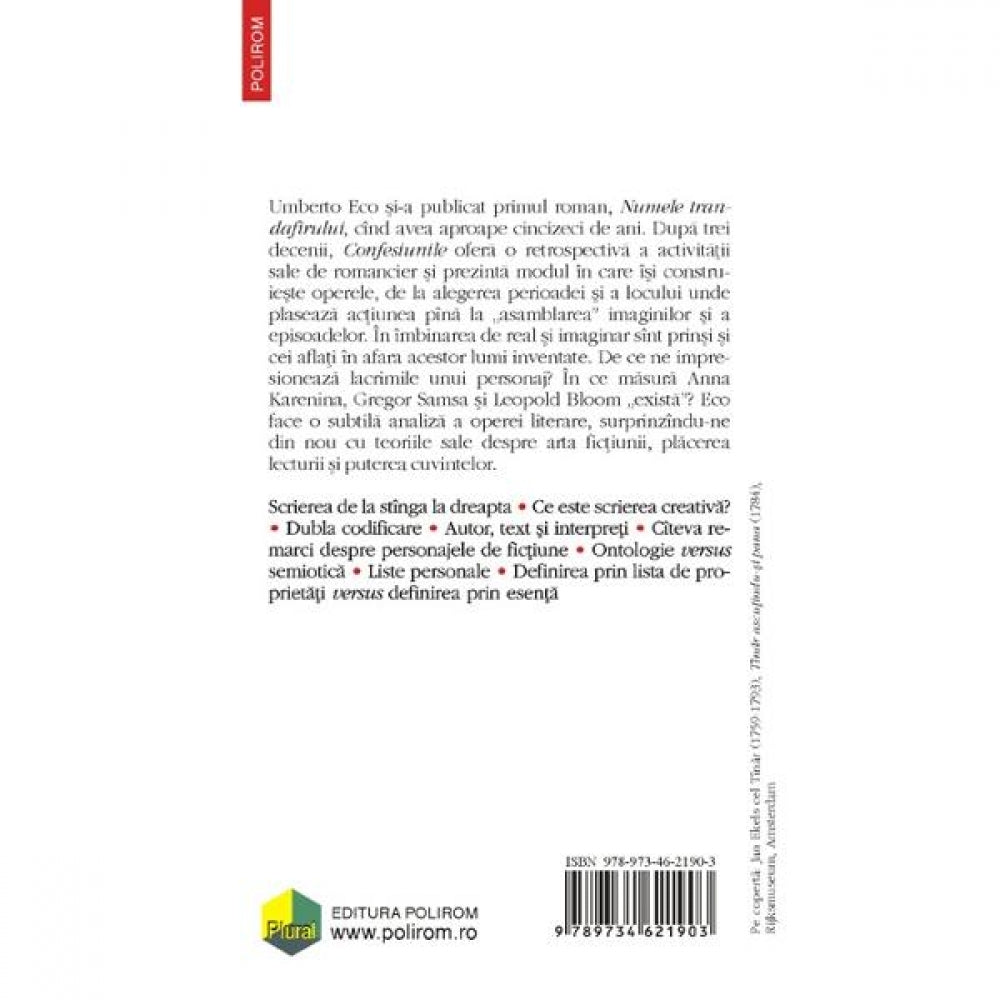 Umberto Eco si-a publicat primul roman, Numele trandafirului, cind avea aproape cincizeci de ani. Dupa trei decenii, Confesiunile ofera o retrospectiva a activitatii sale de romancier si prezinta modul in care isi construieste operele, de la alegerea perioadei si a locului unde plaseaza actiunea pina la „asamblarea” imaginilor si a episoadelor. In imbinarea de real si imaginar sint prinsi si cei aflati in afara acestor lumi inventate.