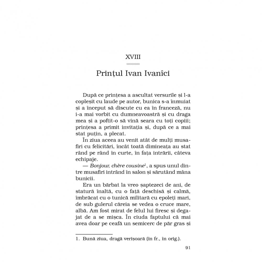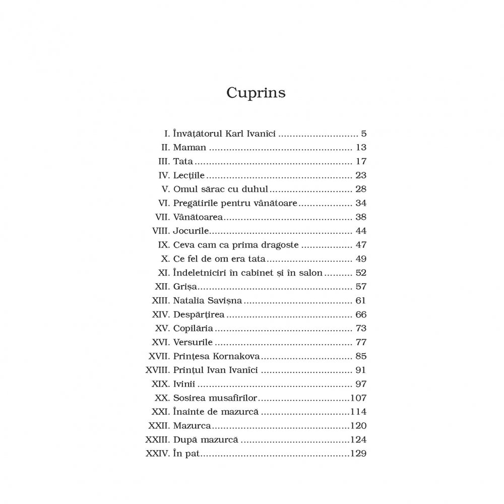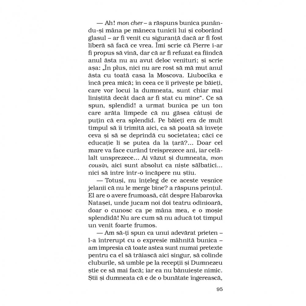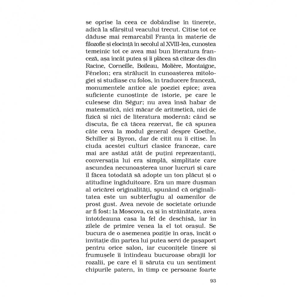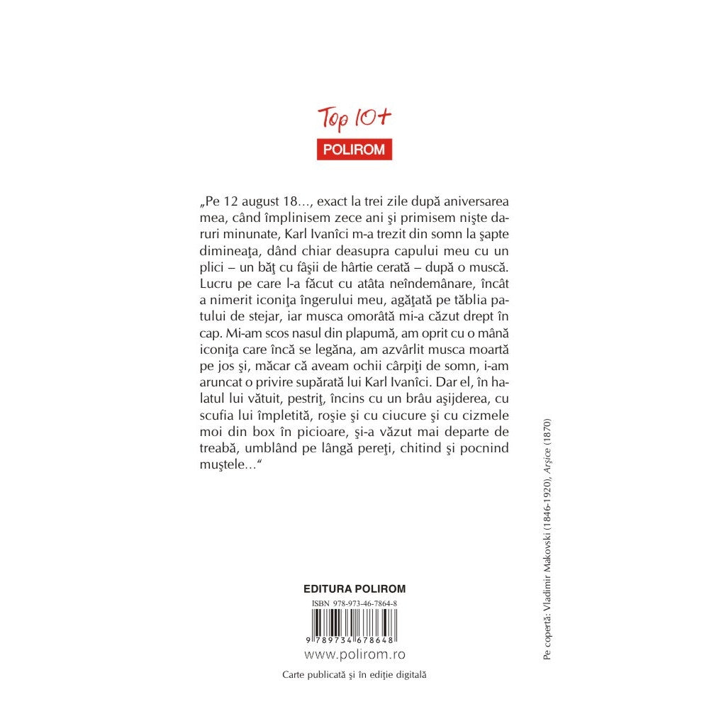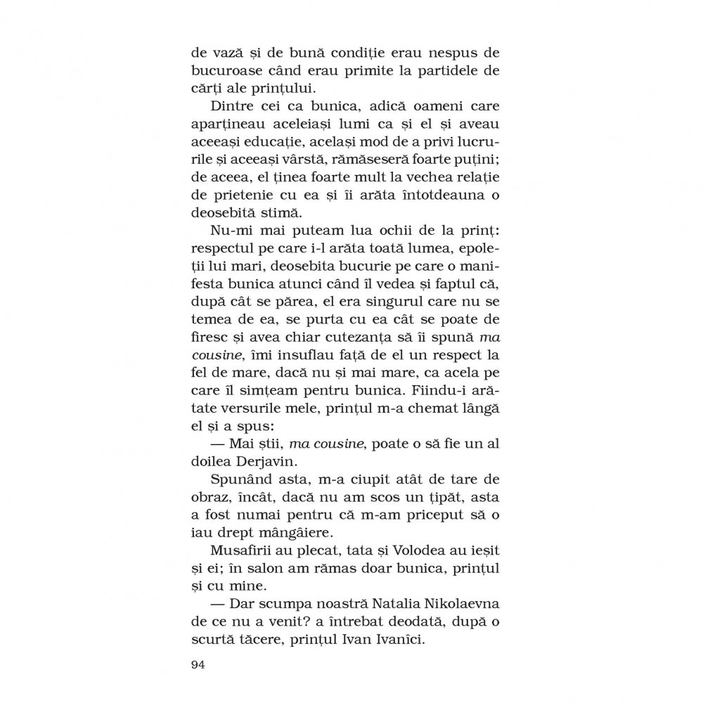 „Pe 12 august 18…, exact la trei zile dupa aniversarea mea, cind implinisem zece ani si primisem niste daruri minunate, Karl Ivanici m‑a trezit din somn la sapte dimineata, dind chiar deasupra capului meu cu un plici – un bat cu fisii de hirtie cerata – dupa o musca. Lucru pe care l‑a facut cu atita neindeminare, incit a nimerit iconita ingerului meu, agatata pe tablia patului de stejar, iar musca omorita mi‑a cazut drept in cap. Mi‑am scos nasul din plapuma, am oprit cu o mina iconita care inca se legana, am azvirlit musca moarta pe jos si, macar ca aveam ochii cirpiti de somn, i‑am aruncat o privire suparata lui Karl Ivanici. Dar el, in halatul lui vatuit, pestrit, incins cu un briu asijderea, cu scufia lui impletita, rosie si cu ciucure si cu cizmele moi din box in picioare, si‑a vazut mai departe de treaba, umblind pe linga pereti, chitind si pocnind mustele…”Lev Nikolaevici Tolstoi (1828‑1910) – celebru scriitor rus, autorul unei opere in care individualul si nationalul capata dimensiuni universale. Incepind cu trilogia autobiografica scrisa in perioada 1852‑1857 si alcatuita din romanele Copilaria, Adolescenta si Tineretea, sondarea „fluiditatii” universului interior si a temeiurilor morale ale omului a devenit principala tema a operelor sale. In nuvela Cazacii (1863), eroul, un tinar aristocrat, redescopera bucuria comunicarii cu natura, viata fireasca si integra a omului simplu. Capodopera Razboi si pace (1863‑1869) zugraveste viata intregii societati ruse in perioada razboaielor napoleoniene; evenimentele istorice si interesele personale, caile de autodefinire a personalitatii si spontaneitatea vietii populare sint prezentate drept componente echivalente ale existentei natural‑istorice. La sfirsitul anilor 1870, scriitorul trece printr‑o criza spirituala amplificata ulterior de ideea desavirsirii morale si a „simplificarii” (care a dat nastere doctrinei si miscarii „tolstoismului”) si intreprinde in operele sale o critica din ce in ce mai accentuata a institutiilor birocratice, a statului, a bisericii (in 1901 a fost excomunicat din Biserica Ortodoxa Rusa), a civilizatiei si culturii, a intregului mod de viata specific „claselor cultivate”: romanul Invierea (1889‑1899), nuvela Sonata Kreutzer, dramele Puterea intunericului (1887) si Cadavrul viu (1900). De asemenea, interesul sau se indreapta spre temele mortii, pacatului, caintei si renasterii morale, in jurul carora sint construite nuvelele Moartea lui Ivan Ilici (1884‑1886), Parintele Serghi (1890‑1898) si Hadji‑Murat (1896‑1904).