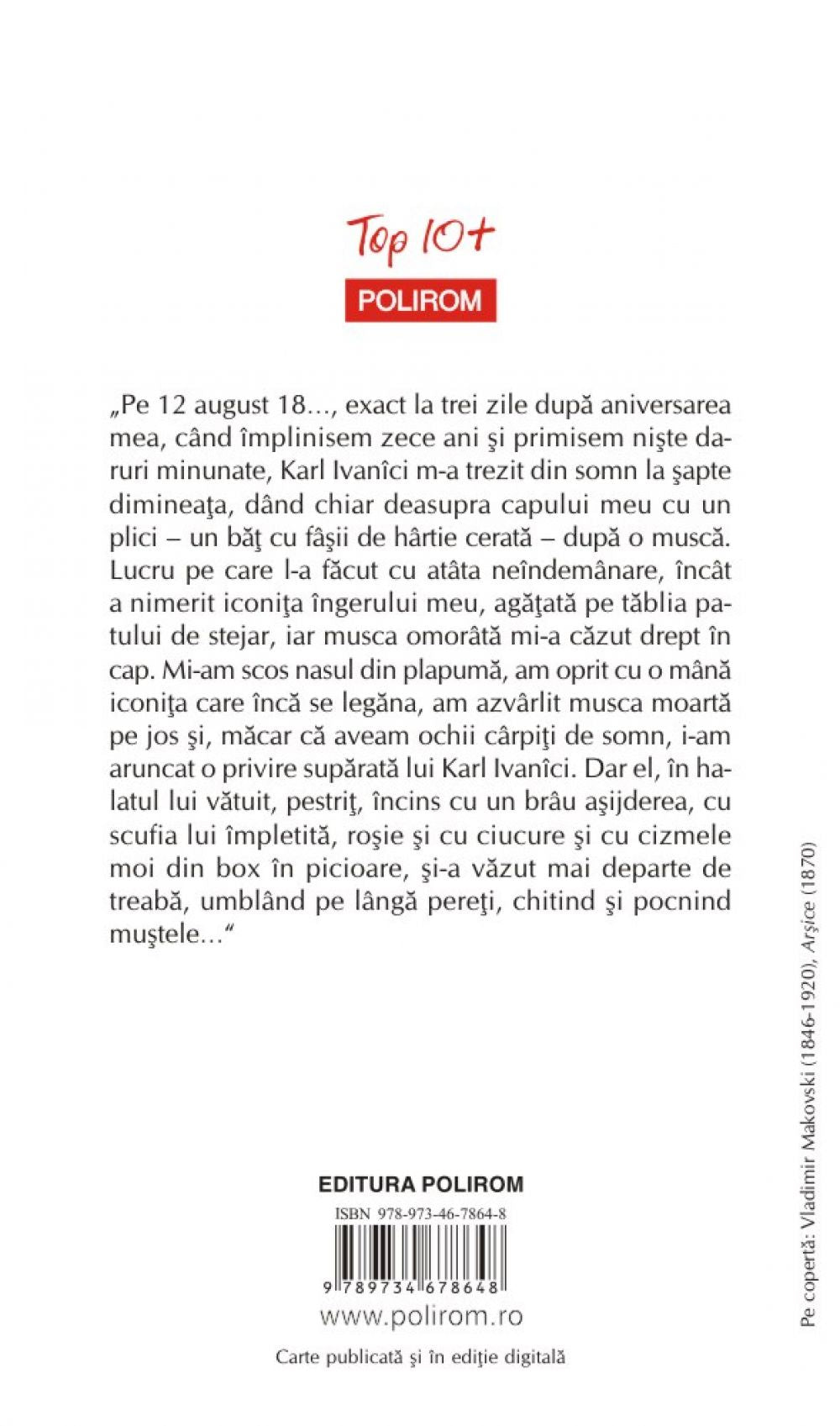 „Pe 12 august 18…, exact la trei zile dupa aniversarea mea, cînd împlinisem zece ani si primisem niste daruri minunate, Karl Ivanîci m‑a trezit din somn la sapte dimineata, dînd chiar deasupra capului meu cu un plici – un bat cu fîsii de hîrtie cerata – dupa o musca. Lucru pe care l‑a facut cu atîta neîndemînare, încît a nimerit iconita îngerului meu, agatata pe tablia patului de stejar, iar musca omorîta mi‑a cazut drept în cap. Mi‑am scos nasul din plapuma, am oprit cu o mîna iconita care înca se legana, am azvîrlit musca moarta pe jos si, macar ca aveam ochii cîrpiti de somn, i‑am aruncat o privire suparata lui Karl Ivanîci. Dar el, în halatul lui vatuit, pestrit, încins cu un brîu asijderea, cu scufia lui împletita, rosie si cu ciucure si cu cizmele moi din box în picioare, si‑a vazut mai departe de treaba, umblînd pe lînga pereti, chitind si pocnind mustele…”