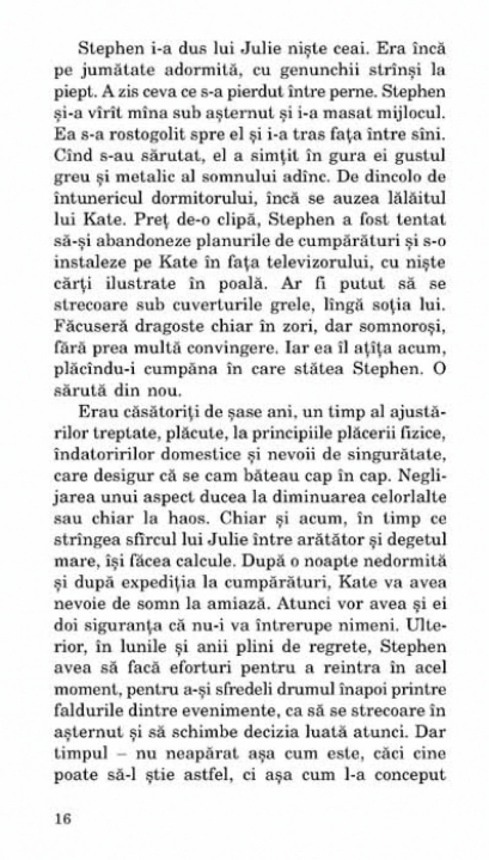 Romanul este o lunga meditatie asupra timpului, din perspectiva emotionala si psihologica a unui barbat coplesit de disparitia fiicei sale de numai trei ani si a carui existenta se schimba dramatic dupa aceasta tragedie. Construit pe mai multe planuri temporale, in care trecutul – loc de refugiu din prezentul prea dureros – revine obsesiv ca introspectie cathartica sau, dimpotriva, culpabilizanta, romanul se tese in jurul a trei familii din generatii diferite si al citorva teme ce se constituie in repere ale existentei colective si individuale: raportul adulti-copii, relatia dintre parinti si timp, nevoia de regasire a virstei copilariei si a inocentei pierdute. Dincolo de dramele personajelor staruie o incredere neclintita in capacitatea omului de a manipula mental contururile timpului, pentru a-i gasi virtutile tamaduitoare.