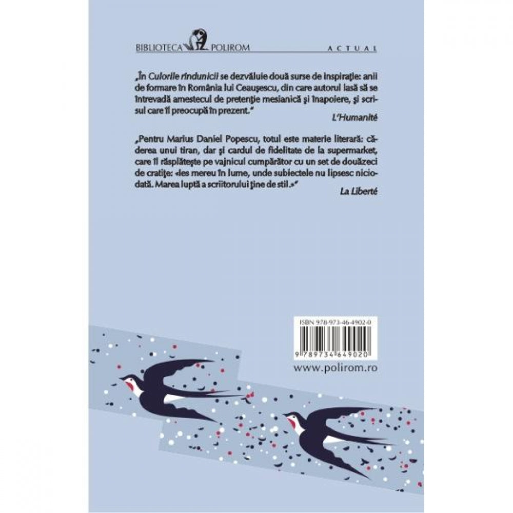 Dupa succesul romanului sau de debut, Simfonia lupului (distins cu Premiul Robert Walser, 2008), Marius Daniel Popescu revine in Culorile rindunicii (Premiul Federal pentru Literatura, 2012; Prix de l’Inaperçu, 2012; premiul special al juriului in cadrul Grand Prix Litteraire du Web, 2012) la tematica si stilul care l-au consacrat ca prozator. Naratiune contrapunctica si fragmentara cu accente autobiografice, Culorile rindunicii este construit ca un puzzle identitar alcatuit din locuri, oameni, gesturi si povesti, in care Romania si Elvetia apar, simultan, ca „tara de aici” si „tara de acolo”. Alternind voci, spatii, perspective si epoci, Culorile rindunicii este nu doar o cartografiere a identitatii pulverizate a scriitorului migrant, ci si o meditatie despre natura si rostul literaturii, despre libertate si constringere de ambele parti ale Cortinei de Fier.