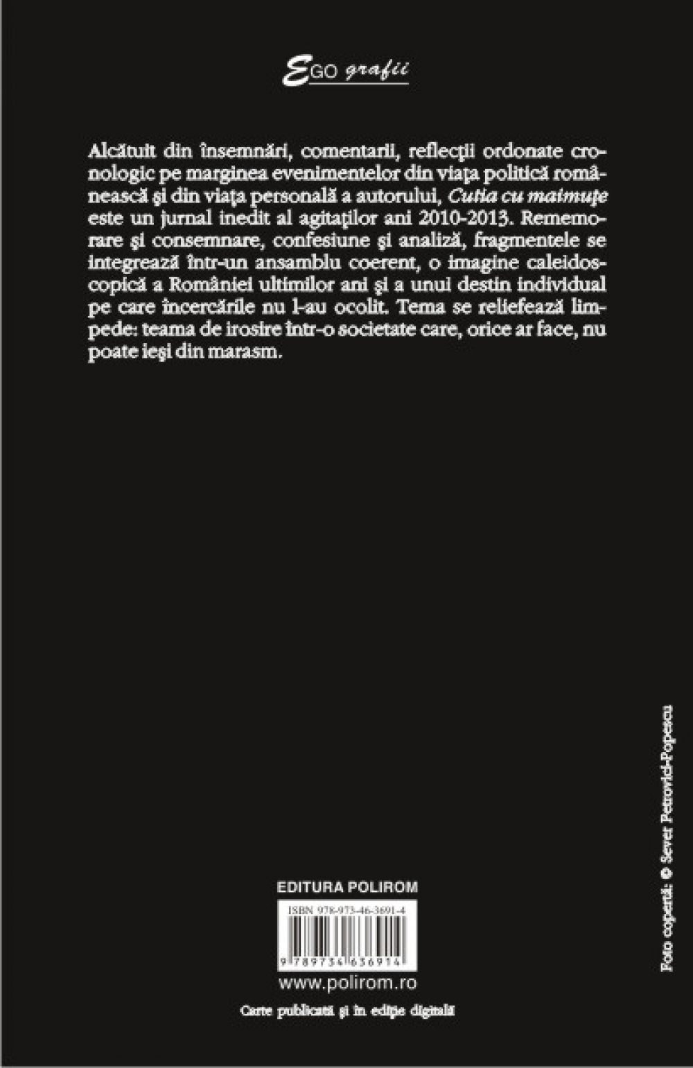 Alcatuit din insemnari, comentarii, reflectii ordonate cronologic pe marginea evenimentelor din viata politica romaneasca si din viata personala a autorului, Cutia cu maimute este un jurnal inedit al agitatilor ani 2010-2013. Rememorare si consemnare, confesiune si analiza, fragmentele se integreaza intr-un ansamblu coerent, o imagine caleidoscopica a Romaniei ultimilor ani si a unui destin individual pe care incercarile nu l-au ocolit. Tema se reliefeaza limpede: teama de irosire intr-o societate care, orice ar face, nu poate iesi din marasm.