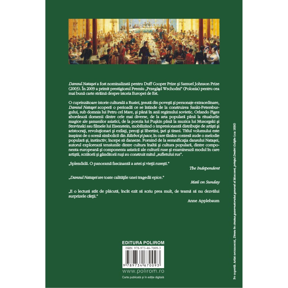 O cuprinzatoare istorie culturala a Rusiei, tesuta din povesti si personaje extraordinare, Dansul Natasei acopera o perioada ce se intinde de la construirea Sankt-Petersburgului, sub domnia lui Petru cel Mare, si pina in anii regimului sovietic. Orlando Figes abordeaza domenii dintre cele mai diverse, de la arta populara pina la ritualurile magice ale samanilor asiatici, de la poezia lui Puskin pina la muzica lui Musorgski si Stravinski sau filmele lui Eisenstein, mobilizind o impresionanta distributie de artisti si aristocrati, revolutionari si exilati, preoti si libertini, tari si tirani.