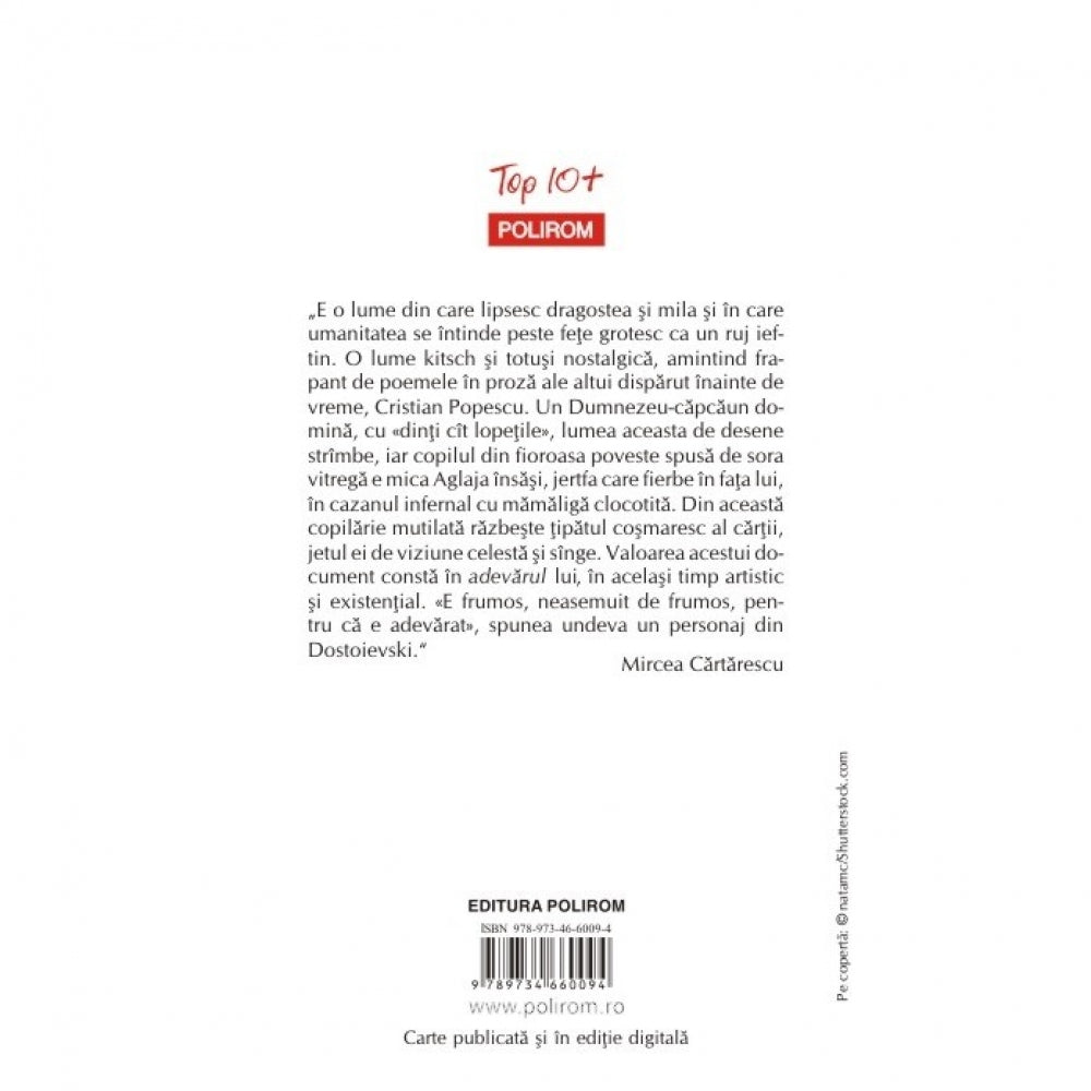 „E o lume din care lipsesc dragostea si mila si in care umanitatea se intinde peste fete grotesc ca un ruj ieftin. O lume kitsch si totusi nostalgica, amintind frapant de poemele in proza ale altui disparut inainte de vreme, Cristian Popescu. Un Dumnezeu-capcaun domina, cu «dinti cit lopetile», lumea aceasta de desene strimbe, iar copilul din fioroasa poveste spusa de sora vitrega e mica Aglaja insasi, jertfa care fierbe in fata lui, in cazanul infernal cu mamaliga clocotita. Din aceasta copilarie mutilata razbeste tipatul cosmaresc al cartii, jetul ei de viziune celesta si singe. Valoarea acestui document consta in adevarul lui, in acelasi timp artistic si existential. «E frumos, neasemuit de frumos, pentru ca e adevarat», spunea undeva un personaj din Dostoievski.” (Mircea Cartarescu)