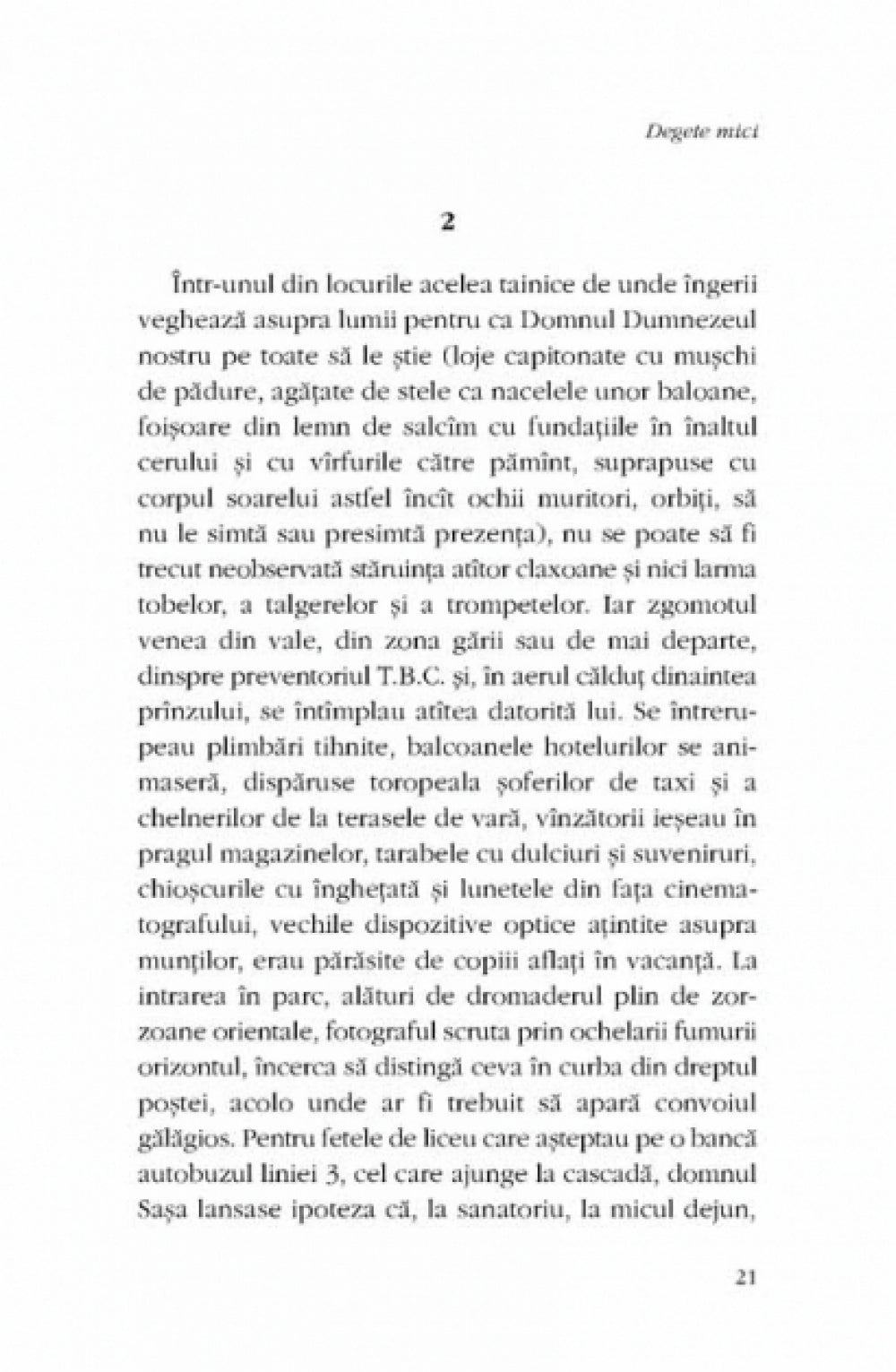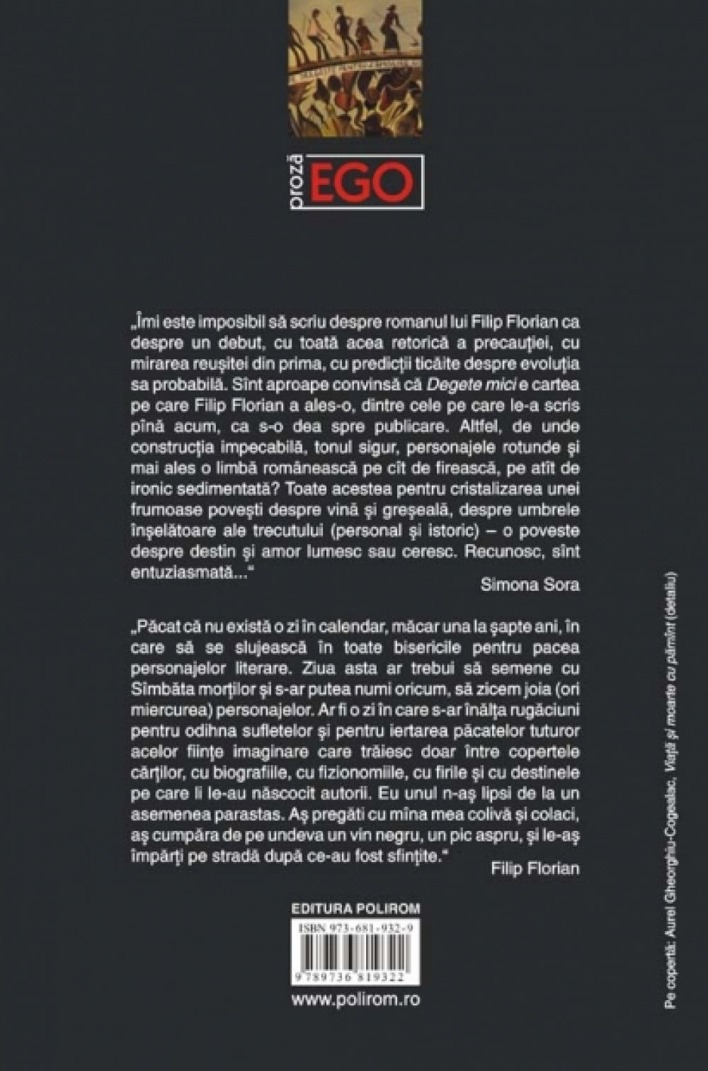 „Inainte de-a se chema Degete mici, romanul meu a avut alte doua titluri: unul (cam) grav, Anotimpurile gropii comune, celalalt (usor) caricatural, Dromaderul si osemintele. Nu-mi displaceau, nici nu ma incintau. Sufereau, in orice caz, de-o boala comuna: pareau sa indice sau macar sa sugereze tema cartii, centrul ei de greutate, insa o faceau in chip mincinos, puneau accentul unde nu e cazul. Exista un mormint colectiv, personajele au de-a face direct ori indirect cu oseminte fara virsta si fara identitate, dar nu primeaza planul lucrurilor palpabile, al intimplarilor imediate. M-au interesat reactiile, pozitionarile, parerile, povestile (totdeauna mai atitatoare, mai adinci) de dinaintea povestii derulate la timpul prezent. Un prieten bun mi-a spus ca Degete mici ar fi un roman politic. Alt prieten bun mi-a spus ca nici pomeneala sa fie asa ceva. Eu cred ca au dreptate.” (Filip Florian)