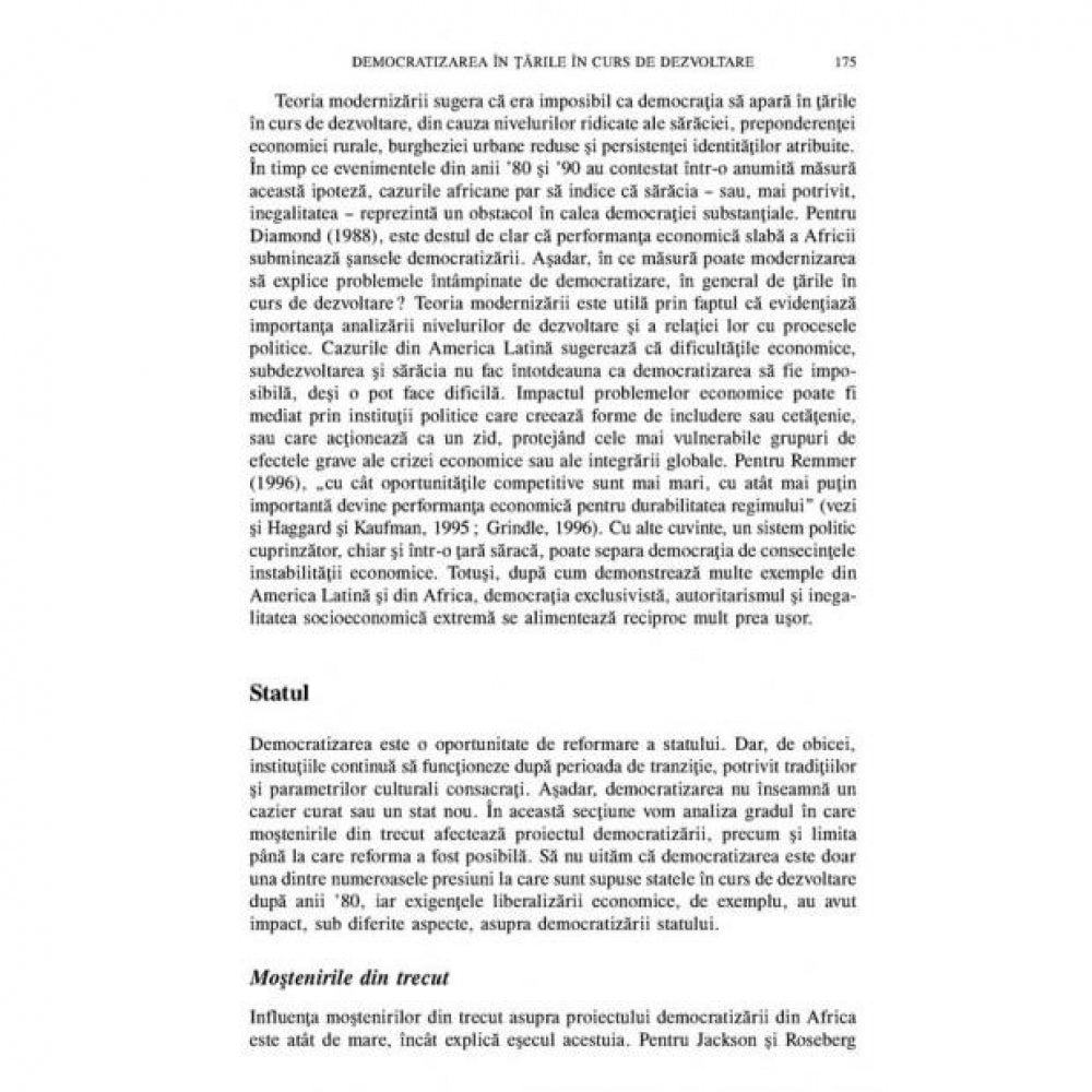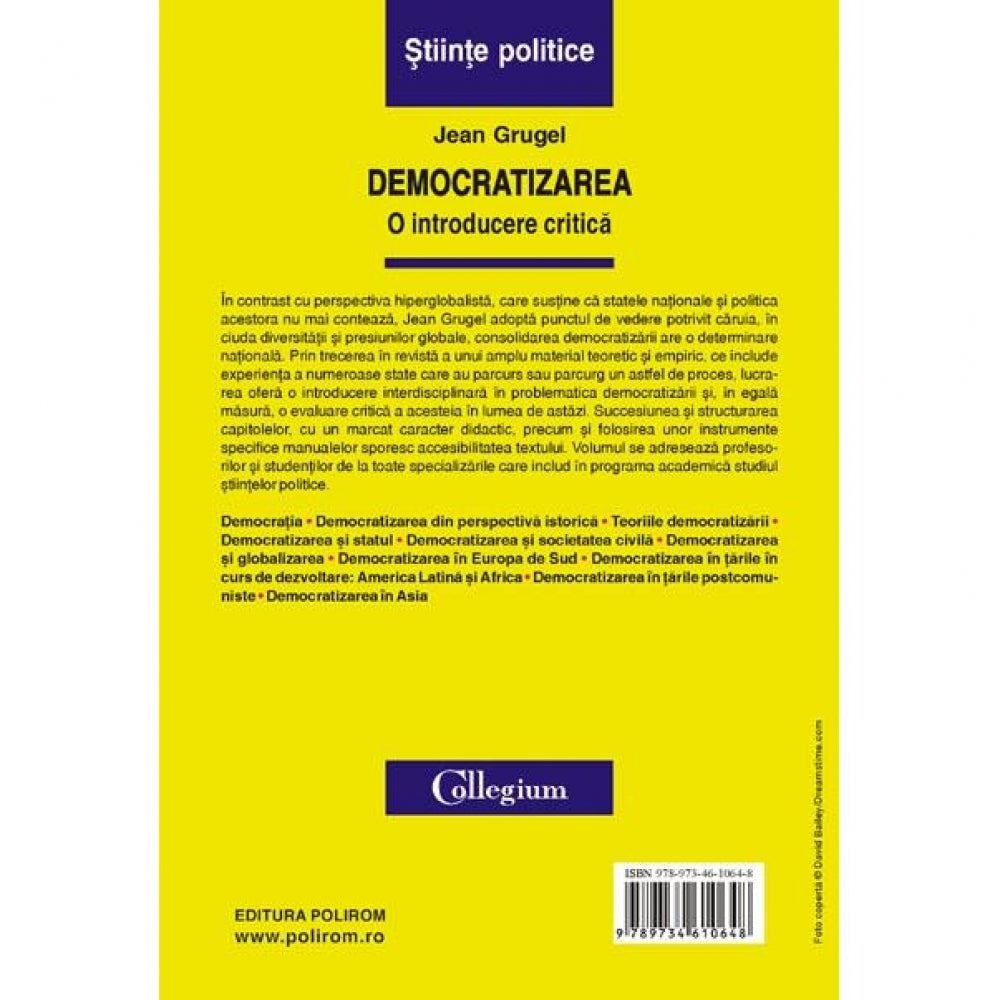 In contrast cu perspectiva hiperglobalista, care sustine ca statele nationale si politica acestora nu mai conteaza, Jean Grugel adopta punctul de vedere potrivit caruia, in ciuda diversitatii si presiunilor globale, consolidarea democratizarii are o determinare nationala. Prin trecerea in revista a unui amplu material teoretic si empiric, ce include experienta a numeroase state care au parcurs sau parcurg un astfel de proces, lucrarea ofera o introducere interdisciplinara in problematica democratizarii si, in egala masura, o evaluare critica a acesteia in lumea de astazi. Succesiunea si structurarea capitolelor, cu un marcat caracter didactic, precum si folosirea unor instrumente specifice manualelor sporesc accesibilitatea textului. Volumul se adreseaza profesorilor si studentilor de la toate specializarile care includ in programa academica studiul stiintelor politice.