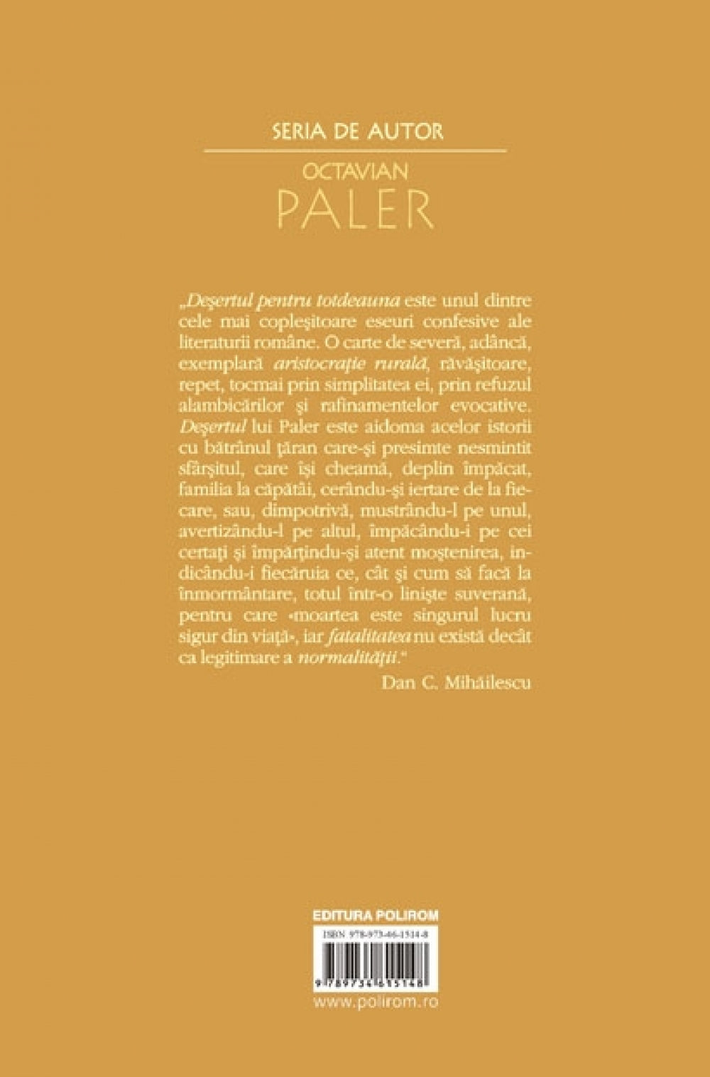 „Desertul pentru totdeauna este unul dintre cele mai coplesitoare eseuri confesive ale literaturii romane. O carte de severa, adinca, exemplara aristocratie rurala, ravasitoare, repet, tocmai prin simplitatea ei, prin refuzul alambicarilor si rafinamentelor evocative. Desertul lui Paler este aidoma acelor istorii cu batrinul taran care-si presimte nesmintit sfirsitul, care isi cheama, deplin impacat, familia la capatii, cerindu-si iertare de la fiecare, sau, dimpotriva, mustrindu-l pe unul, avertizindu-l pe altul, impacindu-i pe cei certati si impartindu-si atent mostenirea, indicindu-i fiecaruia ce, cit si cum sa faca la inmormintare, totul intr-o liniste suverana, pentru care «moartea este singurul lucru sigur din viata», iar fatalitatea nu exista decit ca legitimare a normalitatii.” (Dan C. Mihailescu)