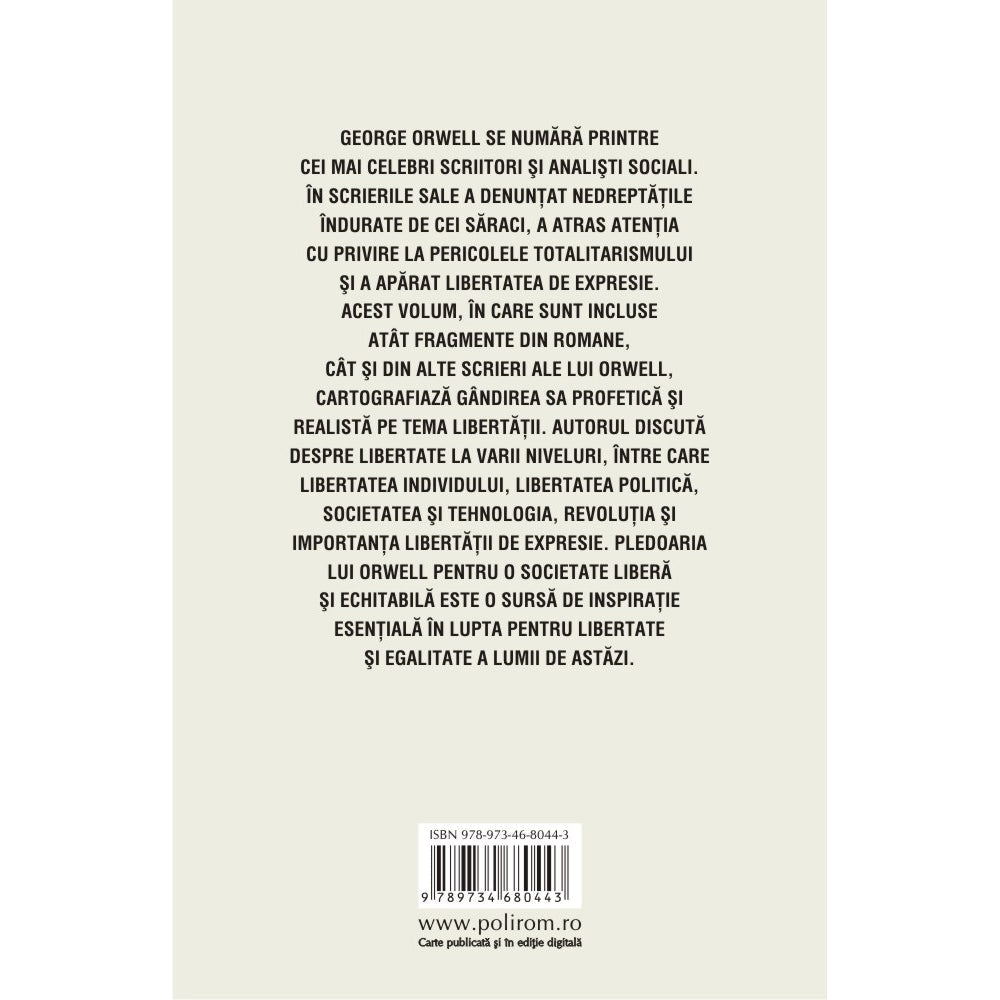 George Orwell se numara printre cei mai celebri scriitori si analisti sociali. In scrierile sale a denuntat nedreptatile indurate de cei saraci, a atras atentia cu privire la pericolele totalitarismului si a aparat libertatea de expresie. Acest volum, in care sint incluse atit fragmente din romane, cit si din alte scrieri ale lui Orwell, cartografiaza gindirea sa profetica si realista pe tema libertatii.