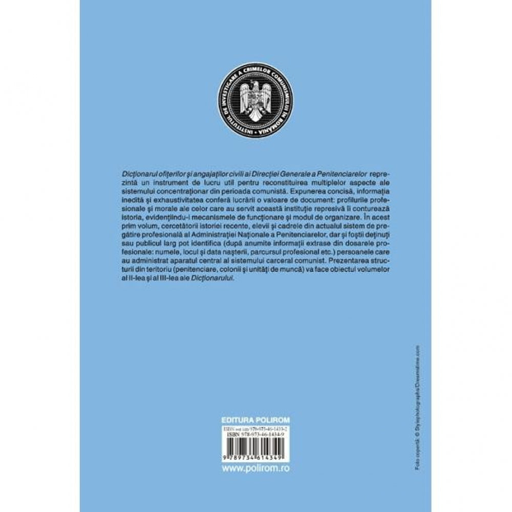 Dictionarul ofiterilor si angajatilor civili ai Directiei Generale a Penitenciarelor reprezinta un instrument de lucru util pentru reconstituirea multiplelor aspecte ale sistemului concentrationar din perioada comunista. Expunerea concisa, informatia inedita si exhaustivitatea confera lucrarii o valoare de document: profilurile profesionale si morale ale celor care au servit aceasta institutie represiva ii contureaza istoria, evidentiindu-i mecanismele de functionare si modul de organizare. In acest prim volum, cercetatorii istoriei recente, elevii si cadrele din actualul sistem de pregatire profesionala al Administratiei Nationale a Penitenciarelor, dar si fostii detinuti sau publicul larg pot identifica (dupa anumite informatii extrase din dosarele profesionale: numele, locul si data nasterii, parcursul profesional etc.) persoanele care au administrat aparatul central al sistemului carceral comunist. Prezentarea structurii din teritoriu (penitenciare, colonii si unitati de munca) va face obiectul volumelor al II-lea si al III-lea ale Dictionarului.