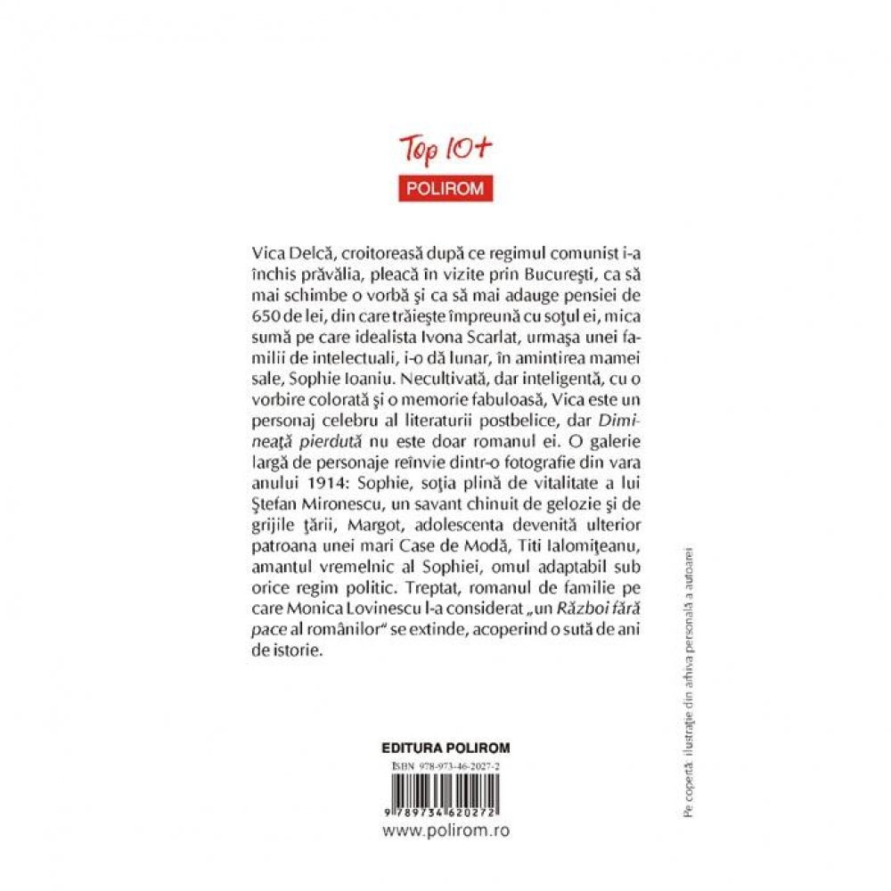 Vica Delca, croitoreasa dupa ce regimul comunist i-a inchis pravalia, pleaca in vizite prin Bucuresti, ca sa mai schimbe o vorba si ca sa mai adauge pensiei de 650 de lei, din care traieste impreuna cu sotul ei, mica suma pe care idealista Ivona Scarlat, urmasa unei familii de intelectuali, i-o da lunar, in amintirea mamei sale, Sophie Ioaniu. Necultivata, dar inteligenta, cu o vorbire colorata si o memorie fabuloasa, Vica este un personaj celebru al literaturii postbelice, dar Dimineata pierduta nu este doar romanul ei. O galerie larga de personaje reinvie dintr-o fotografie din vara anului 1914: Sophie, sotia plina de vitalitate a lui Stefan Mironescu, un savant chinuit de gelozie si de grijile tarii, Margot, adolescenta devenita ulterior patroana unei mari Case de Moda, Titi Ialomiteanu, amantul vremelnic al Sophiei, omul adaptabil sub orice regim politic. Treptat, romanul de familie pe care Monica Lovinescu l-a considerat „un Razboi fara pace al romanilor” se extinde, acoperind o suta de ani de istorie.