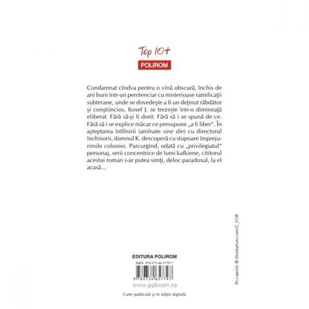 Condamnat cindva pentru o vina obscura, inchis de ani buni intr-un penitenciar cu misterioase ramificatii subterane, unde se dovedeste a fi un detinut rabdator si constiincios, Kosef J. se trezeste intr-o dimineata eliberat. Fara sa-si fi dorit. Fara sa i se spuna de ce. Fara sa i se explice macar ce presupune „a fi liber”. In asteptarea intilnirii (aminate sine die) cu directorul inchisorii, domnul K. descopera cu stupoare imprejurimile coloniei. Parcurgind, odata cu „privilegiatul” personaj, serii concentrice de lumi kafkiene, cititorul acestui roman s-ar putea simti, deloc paradoxal, la el acasa...