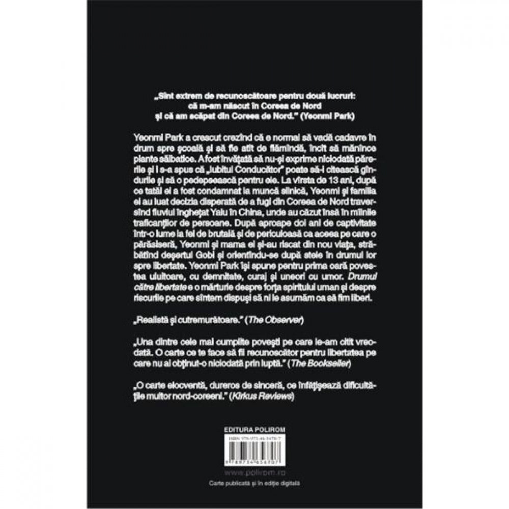 Yeonmi Park a crescut crezind ca e normal sa vada cadavre in drum spre scoala si sa fie atit de flaminda, incit sa manince plante salbatice. A fost invatata sa nu-si exprime niciodata parerile si i s-a spus ca „Iubitul Conducator” poate sa-i citeasca gindurile si sa o pedepseasca pentru ele. La virsta de 13 ani, dupa ce tatal ei a fost condamnat la munca silnica, Yeonmi si familia ei au luat decizia disperata de a fugi din Coreea de Nord traversind fluviul inghetat Yalu in China, unde au cazut insa in miinile traficantilor de persoane. Dupa aproape doi ani de captivitate intr-o lume la fel de brutala si de periculoasa ca aceea pe care o parasisera, Yeonmi si mama ei si-au riscat din nou viata, strabatind desertul Gobi si orientindu-se dupa stele in drumul lor spre libertate. Yeonmi Park isi spune pentru prima oara povestea uluitoare, cu demnitate, curaj si uneori cu umor. Drumul catre libertate e o marturie despre forta spiritului uman si despre riscurile pe care sintem dispusi sa ni le asumam ca sa fim liberi.
