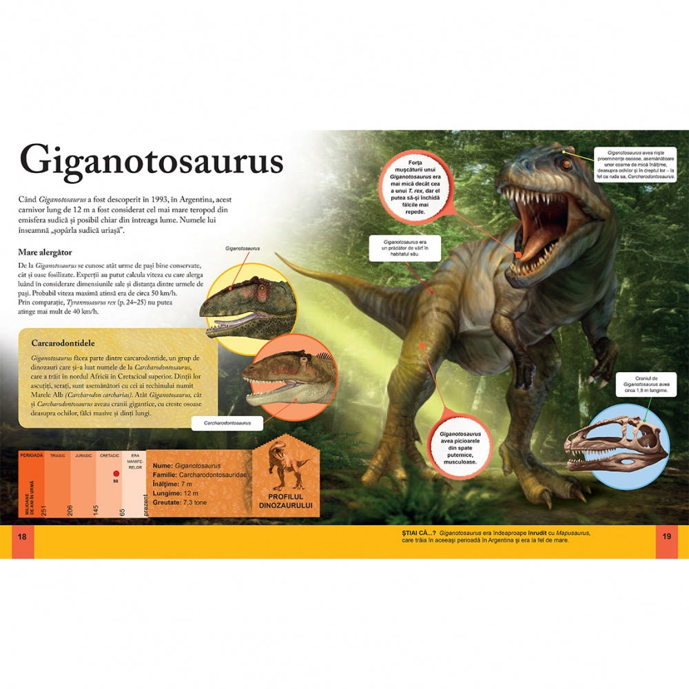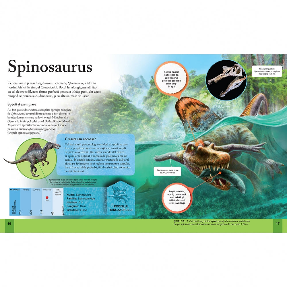 Citind aceasta enciclopedie vizuala cuprinzatoare copilul dumneavoatra va patrunde in misterioasa lume preistorica si va afla amanunte interesante despre 60 de dinozauri cunoscuti. Plin de date fascinante si ilustratii impresionante, absolut noi, bazate pe cele mai recente studii paleontologice, volumul de fata contine o prezentare de la A la Z a dinozaurilor – de la Allosaurus la Zuniceratops.