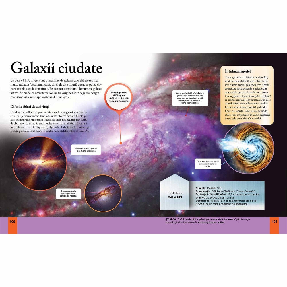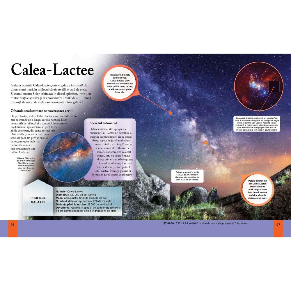 Cu ajutorul acestei enciclopedii vizuale cuprinzatoare copilul dumneavoatra va putea calatori prin lumea fascinanta a astrelor, familiarizandu-se cu diverse evenimente galactice: de la Big Bang la constructia unor telescoape extrem de mari. Plina de date captivante, de fotografii impresionante si de imagini artistice generate pe calculator, bazate pe ultimele cercetari din astronomie, aceasta carte este un excelent ghid prin Sistemul nostru Solar, prin Universul nostru si chiar dincolo de el…