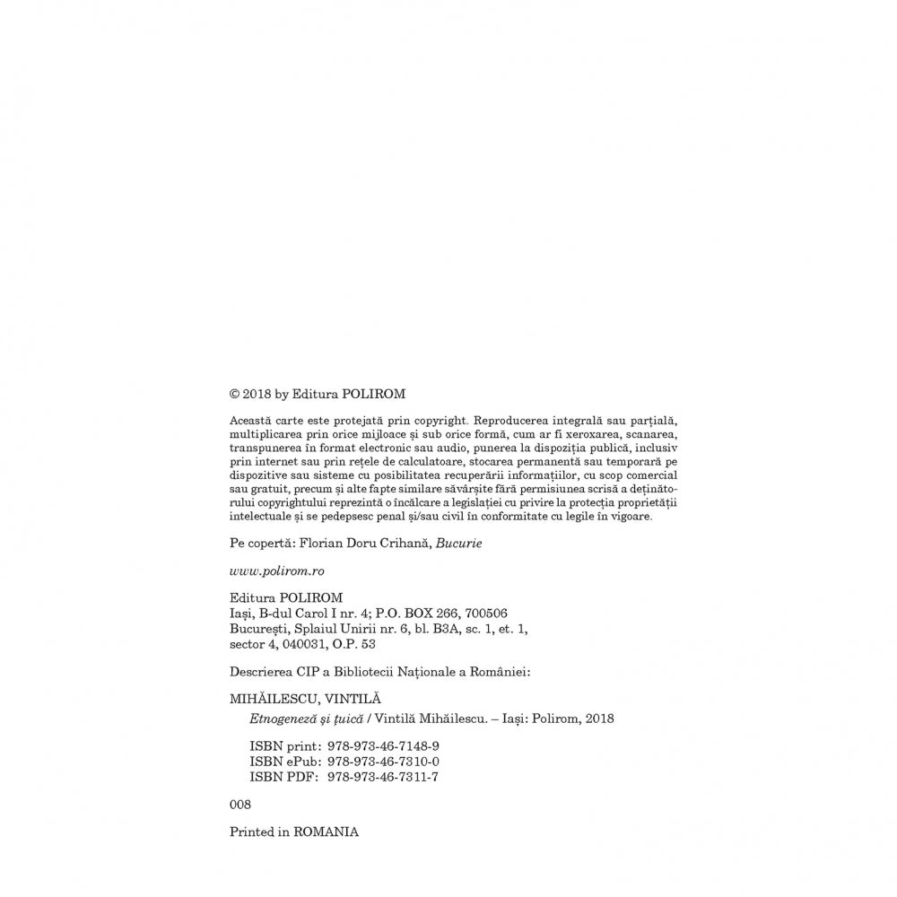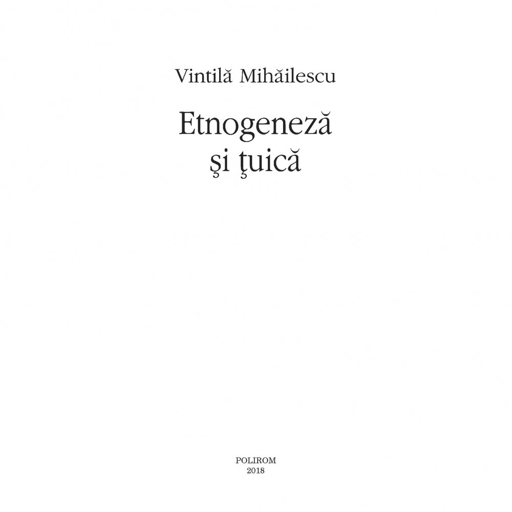 Noul volum al lui Vintila Mihailescu contureaza imaginea societatii romanesti contemporane, trecind de la realitatea imediata, cu noile „tehnici ale sinelui” si device-uri ce creeaza dependenta, la „actualitatea trecutului”, tinut la loc sigur in memoria colectiva, ori la „dilemele viitorului”, pindit prin oglinzi magice inainte de-a fi inteles intii si-ntii realitatea timpurilor in care ne ducem traiul. Incursiunile spumoase in istoria noastra mai recenta sau mai indepartata explica mentalitati si obiceiuri vechi de cind lumea, ubicua diviziune dintre noi si celalalt, legaturile candide dintre „rumani” si licorile faurite pe teritoriul nostru cu-atita mestesugire de-a lungul istoriei zbuciumate, toate acestea facind ca Etnogeneza si tuica sa fie o lectura care ne invita la introspectie.